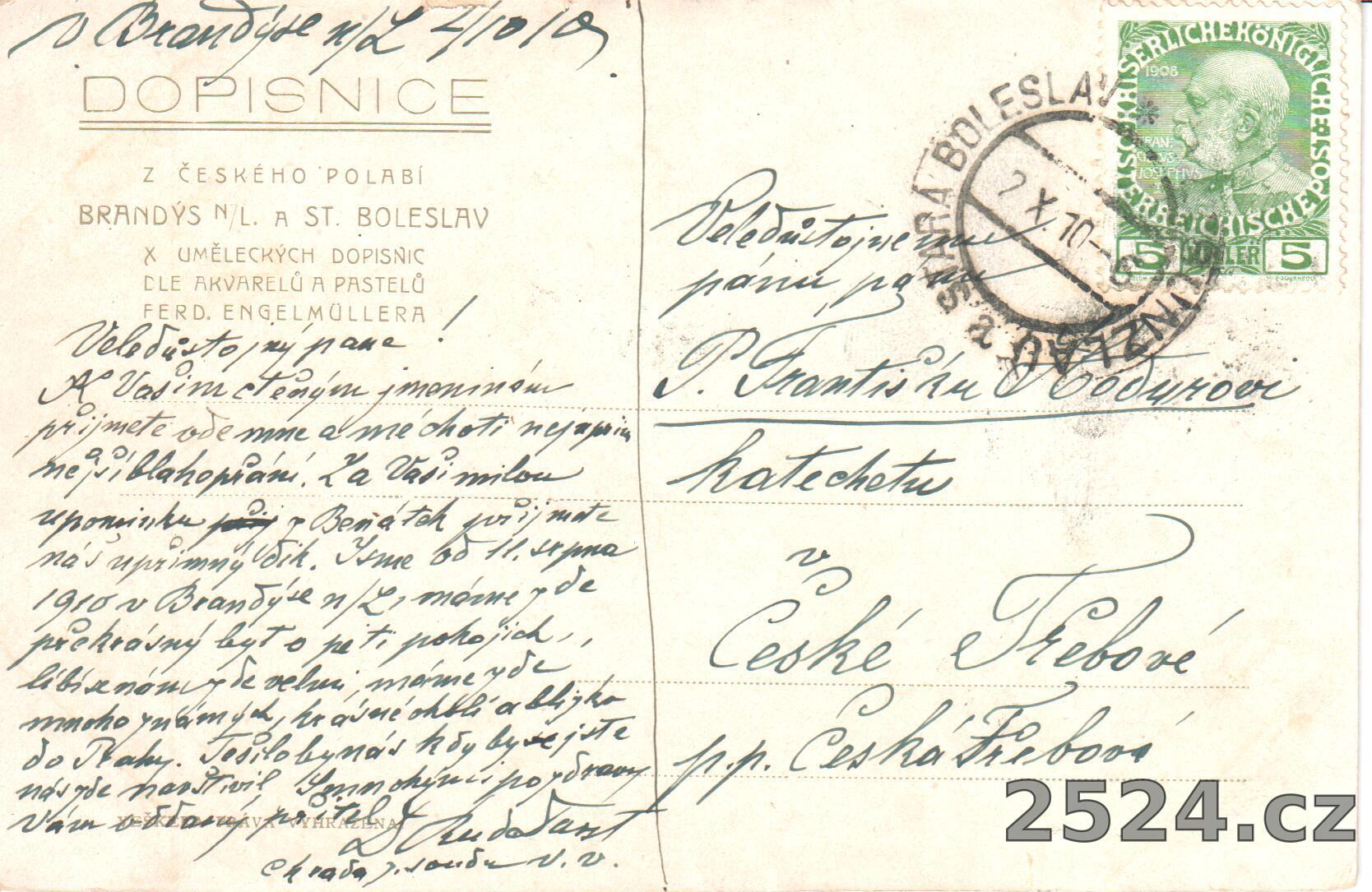 Popis: prošlá 1910; pohlednice z cyklu: Dopisnice českého polabí Brandýs n.L. a St. Boleslav X. uměleckých dopisnic dle akvarelů a pastelů Ferd. Engelmüllera