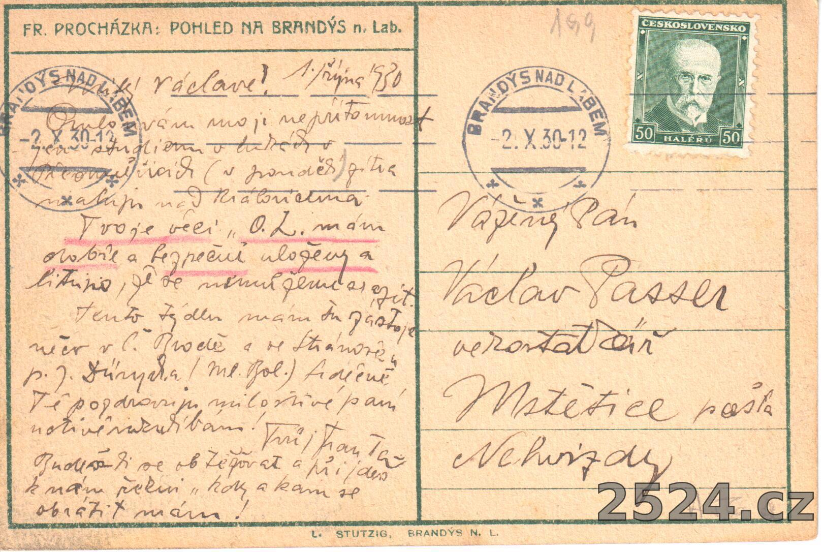 Popis: prošlá 1930, pohlednice ze sady pohlednic malíře F. X. Procházky