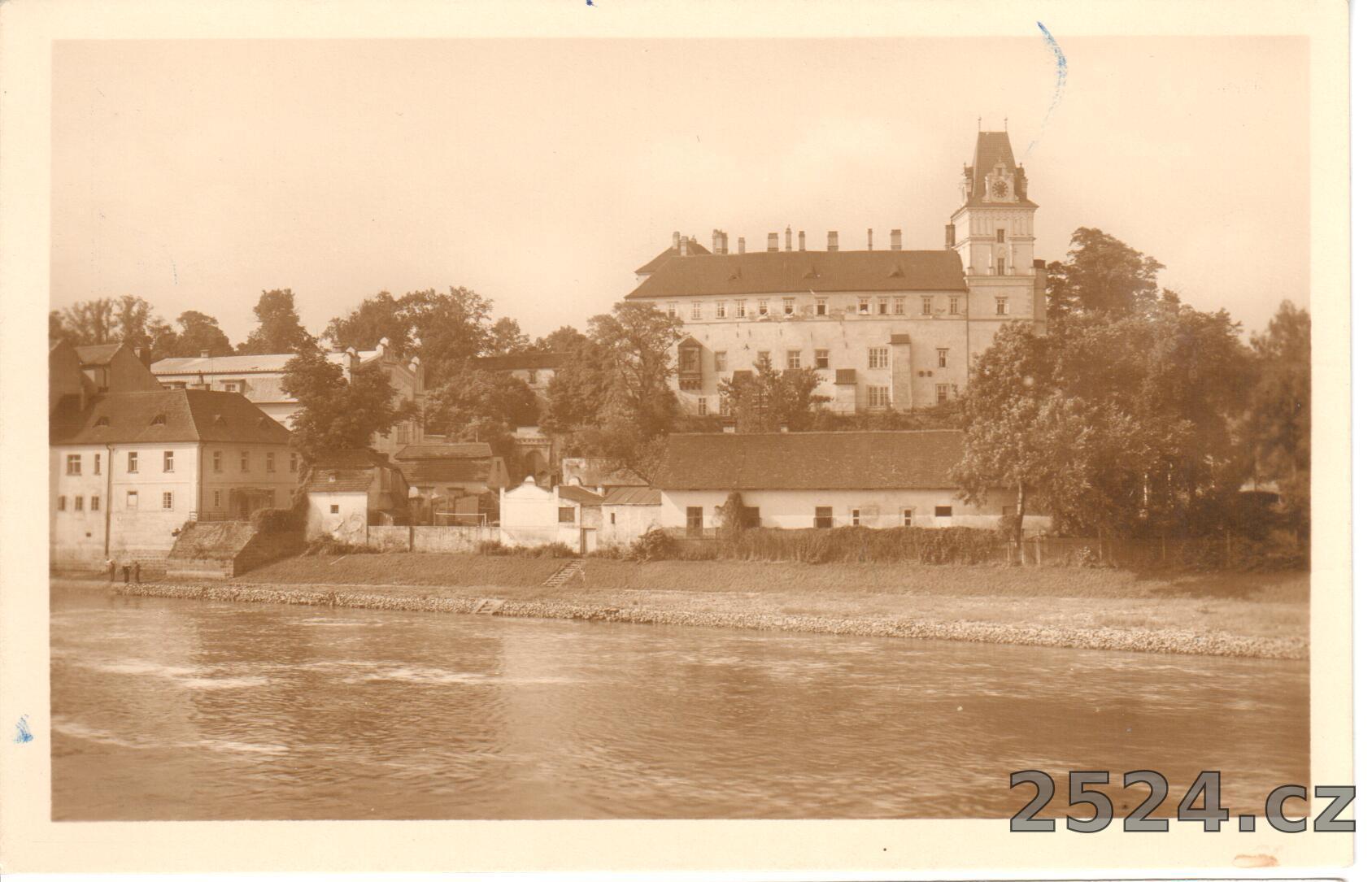 Popis: neprošlá; popsaná dětma; pohled na zámek přes Labe