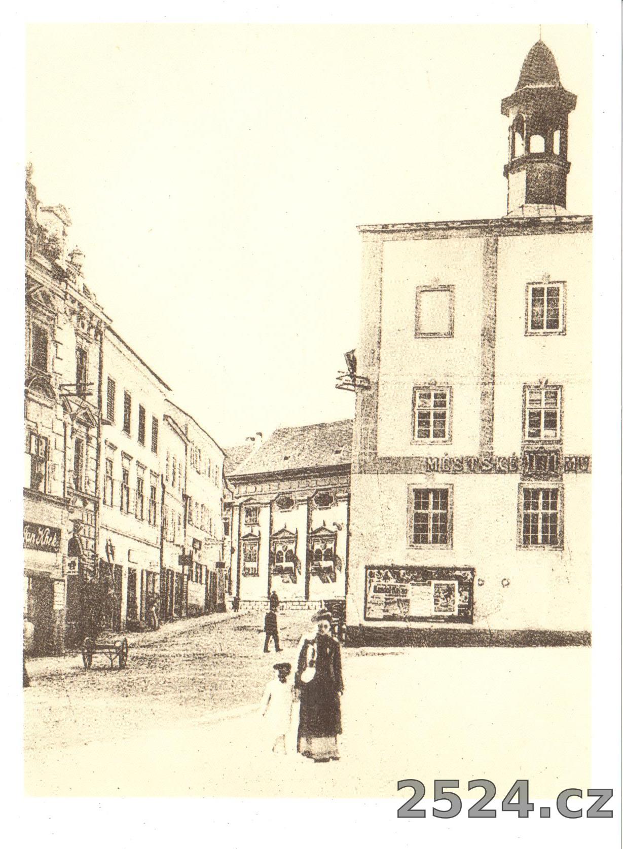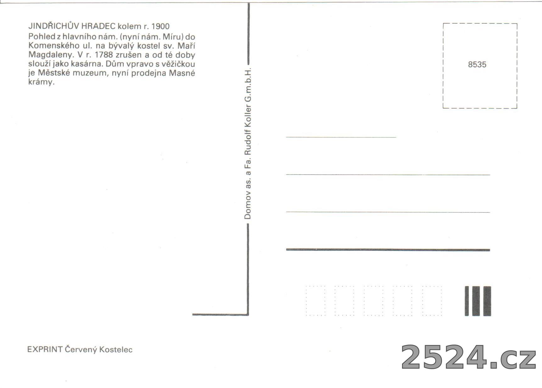 Popis: neprošlá; replika staré pohlednice cca 1900; Pohled z hlavního náměstí do Komenského ulice