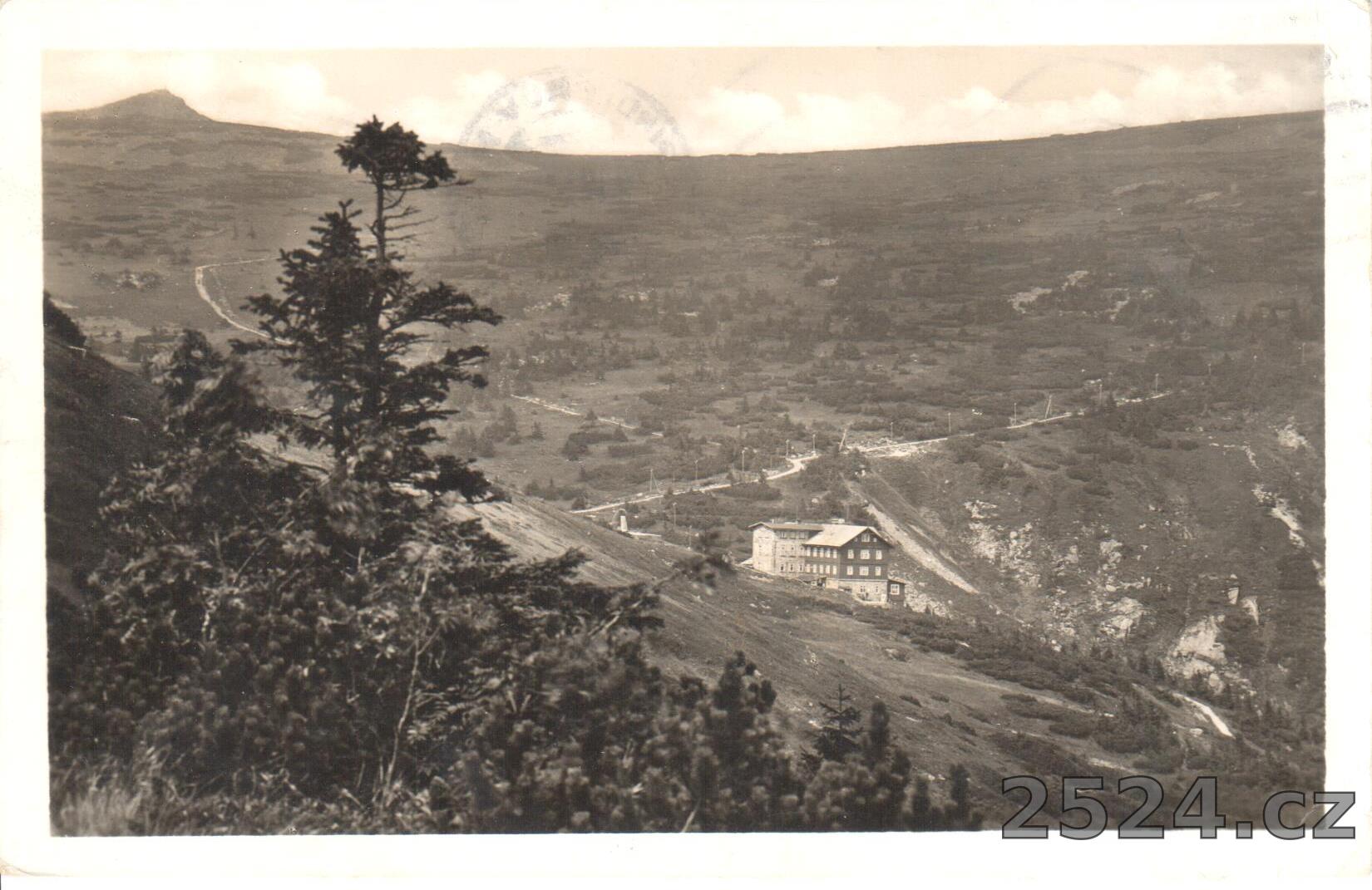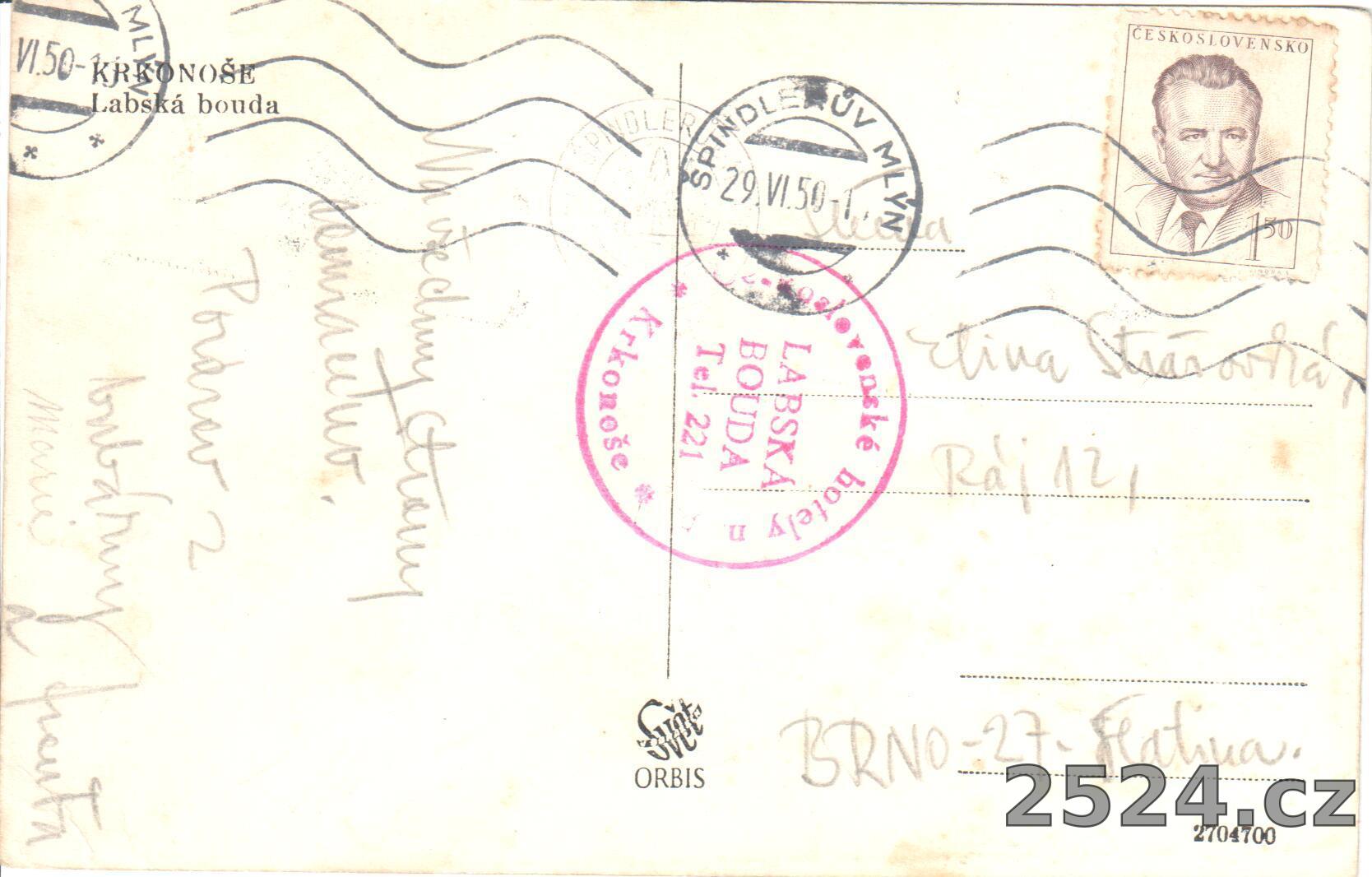 Popis: prošlá 1950; razítko Československé hotely n.p. Labská bouda tel. 221 Krkonoše.