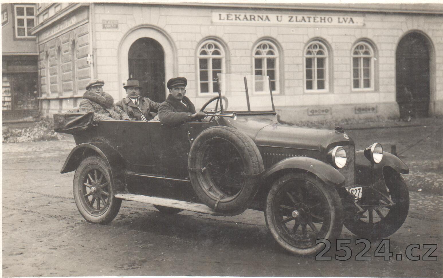 Popis: Neprošlá, historické auto - poznáte ho? Poznámka na druhé straně: Strýc Ladík Roudný sedí vzadu vlevo vozu.