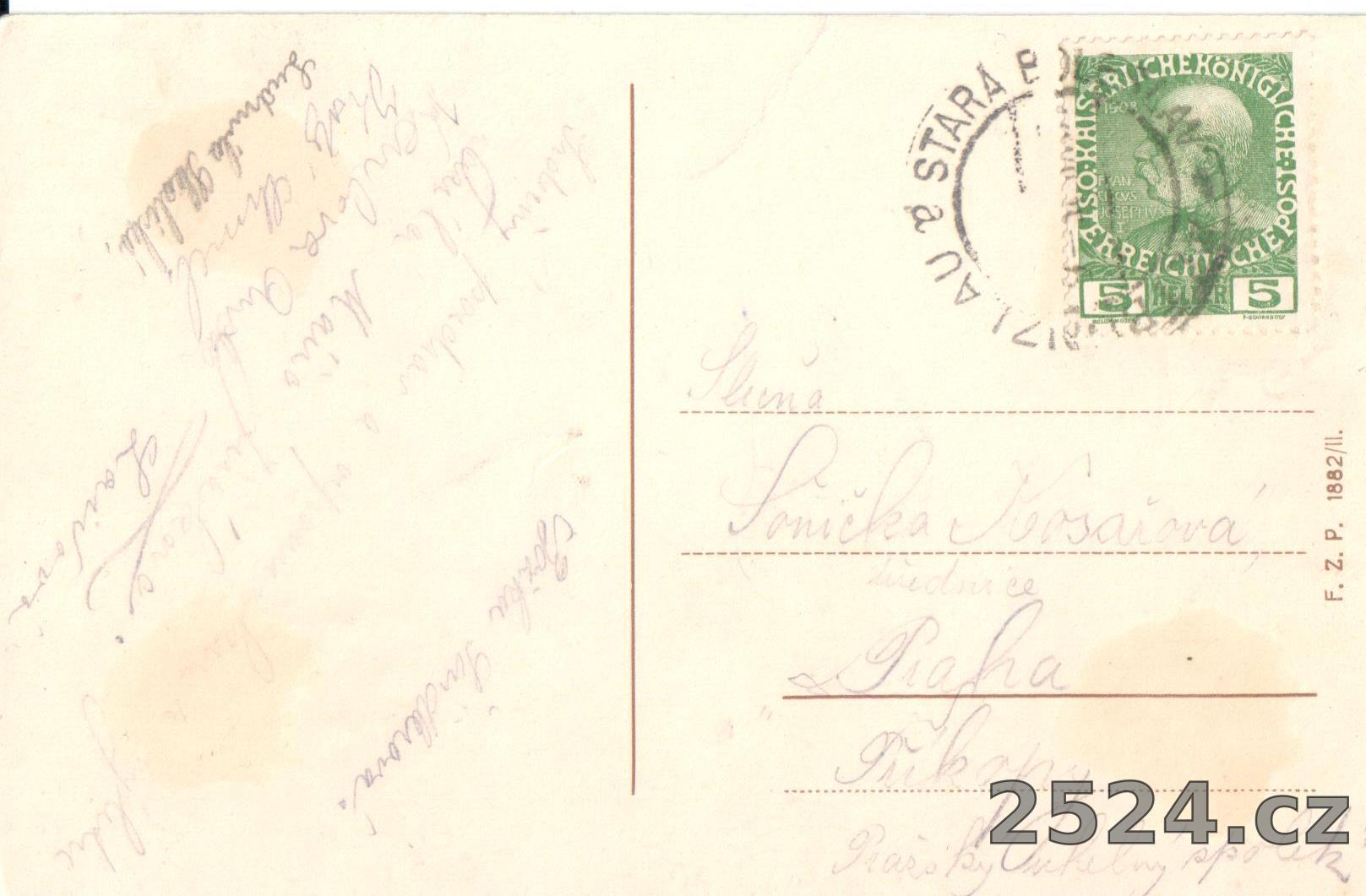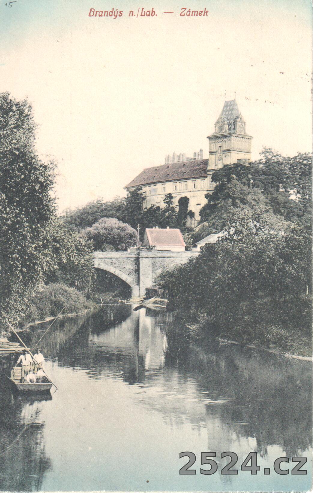 Popis: prošlá; pohled na zámek z mostu na Ostrůvek, loďka