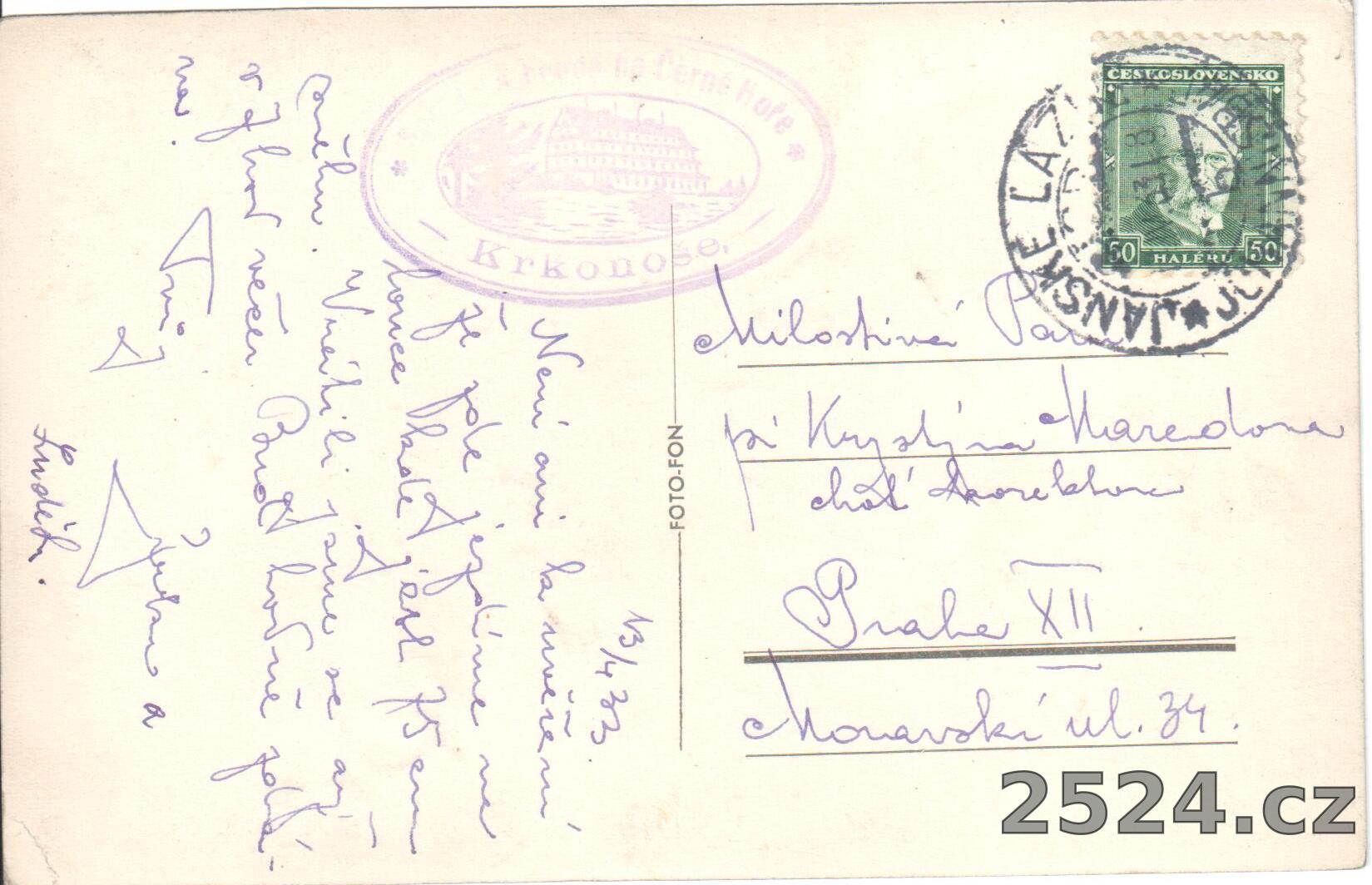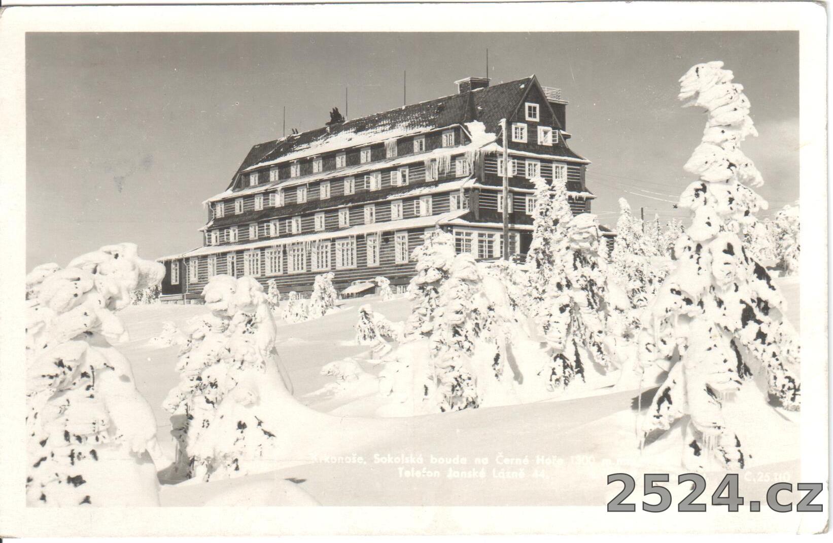 Popis: prošlá; Sokolská bouda na Černé hoře 1300 m. n. m. , Telefon Jánsk Lázně 44 razítko boudy;