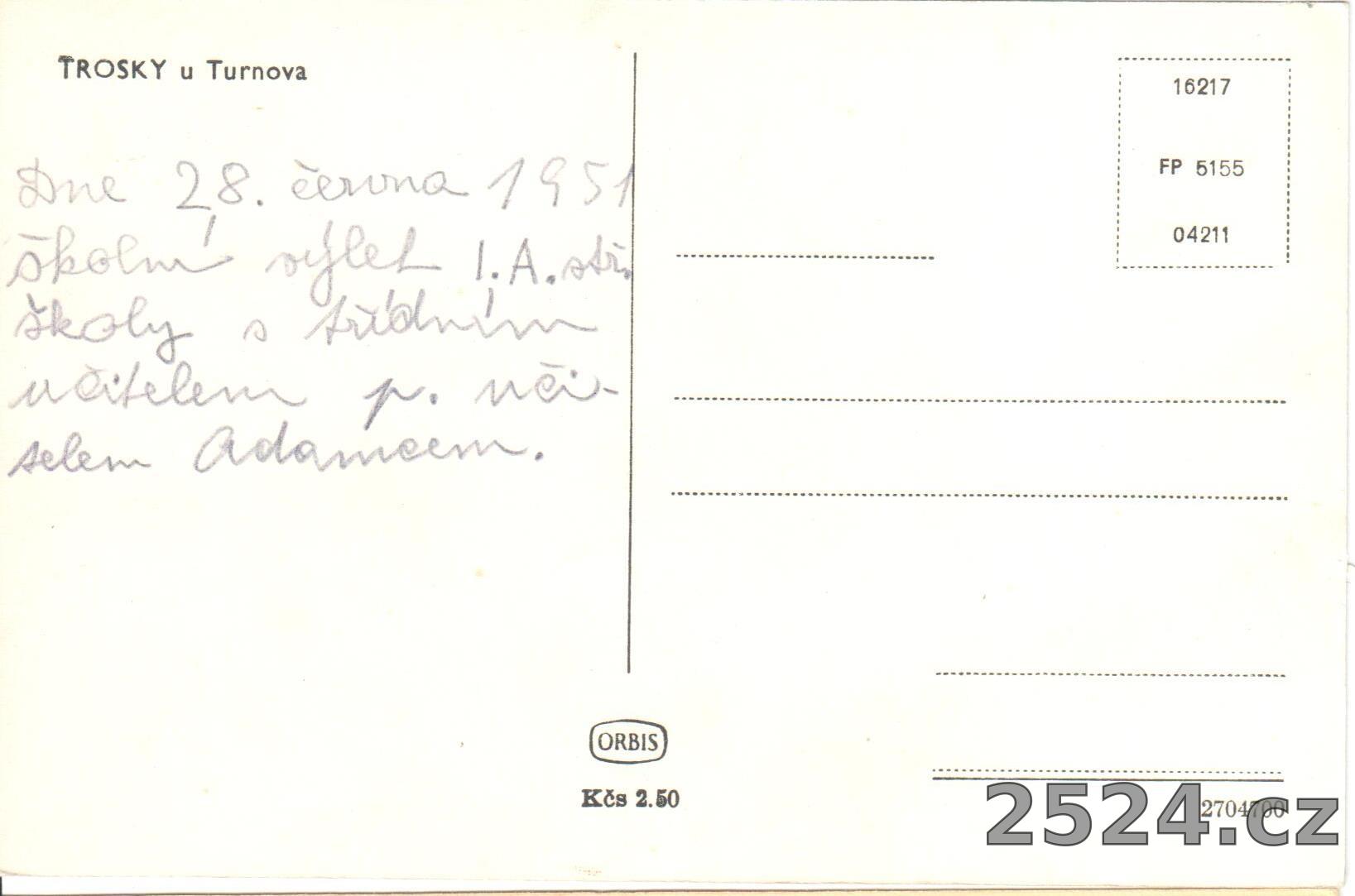 Popis: neprošlá; s textem: Dne 28. června 1951 školní výlet I.A stř. školy s třídním učitelem p. učitelem Adamcem.