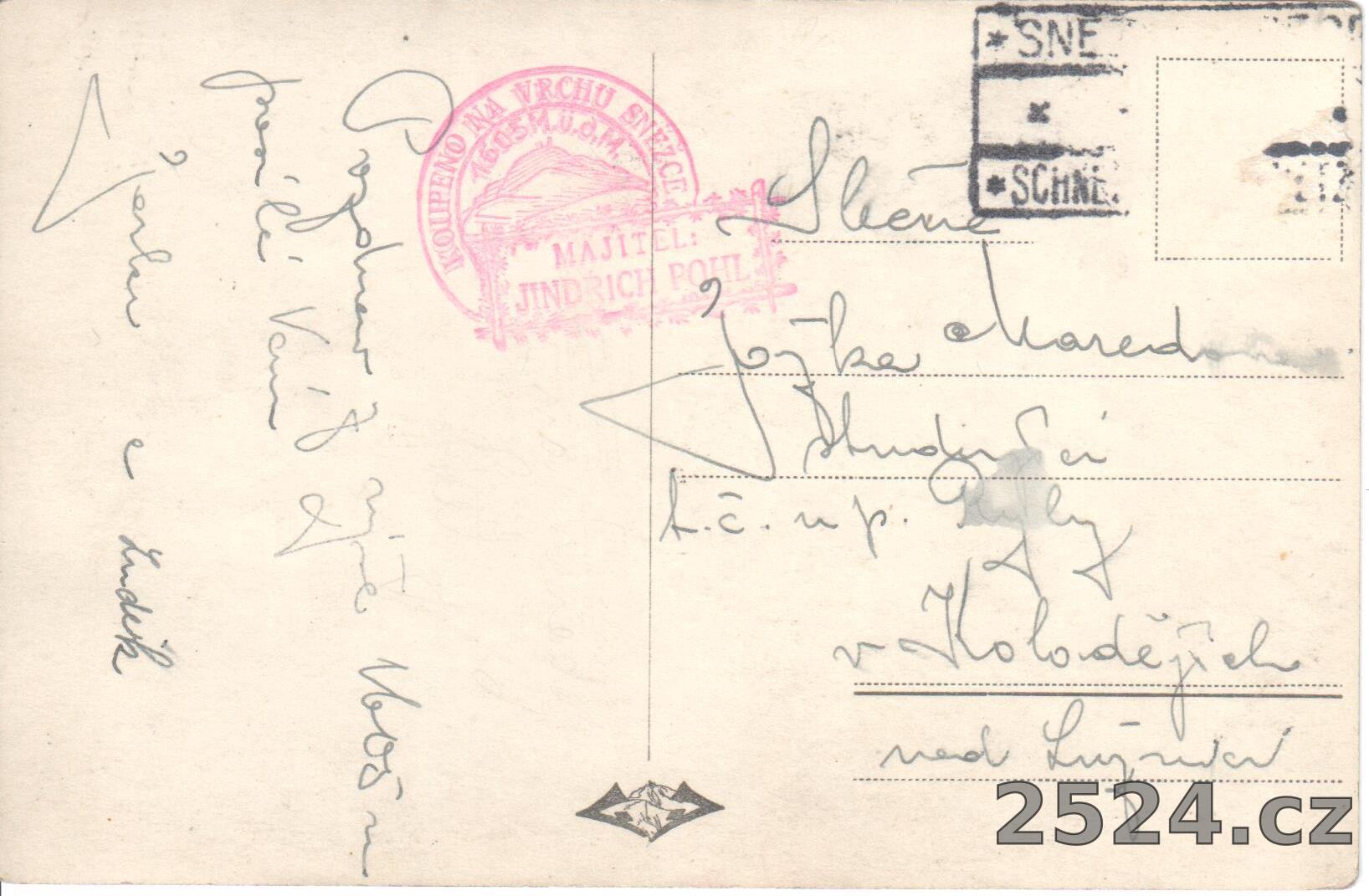 Popis: prošlá; razítko Koupeno na vrcholu Sněžky majitel Jindřich POHL