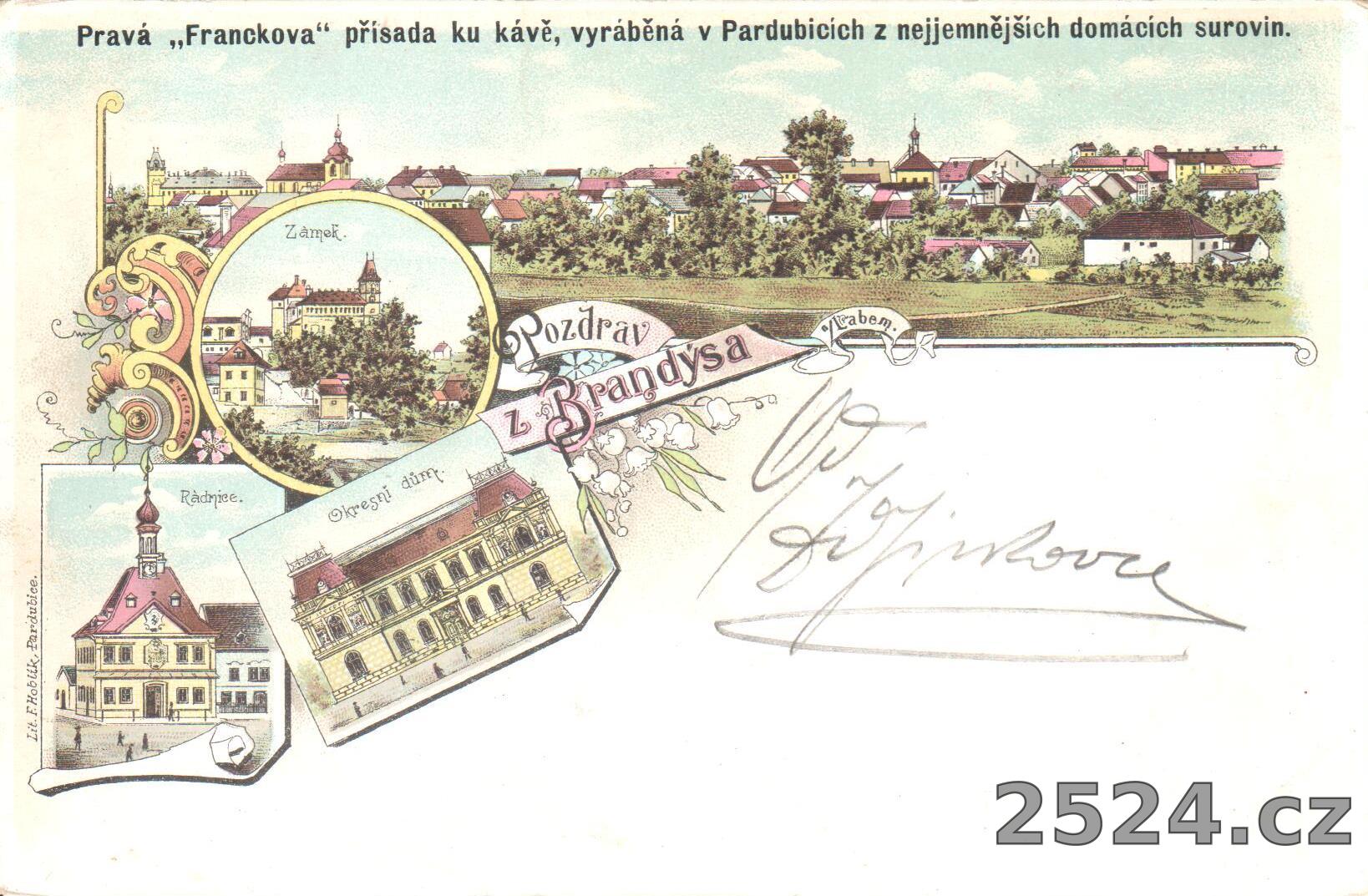 Popis: neprošlá, s nadepsanou adresou; s reklamním přítiskem, Pravá "Franckova" přísada ku kávě, vyráběná v Pardubicích z nejjemnějších domácích surovin.