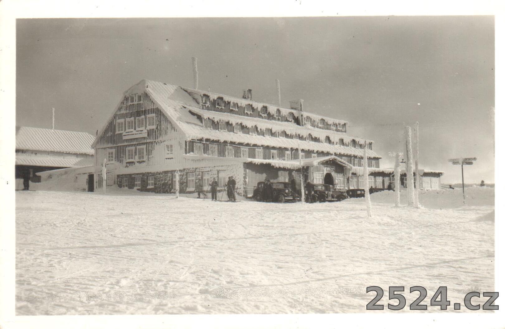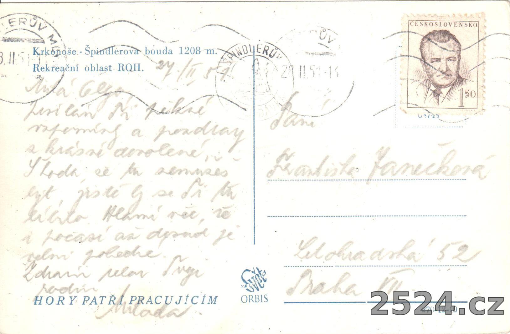 Popis: prošlá 1951; Špindlerova bouda 1208 m. n. m. ; Rekreační oblast ROH, Hory patří pracujícím.