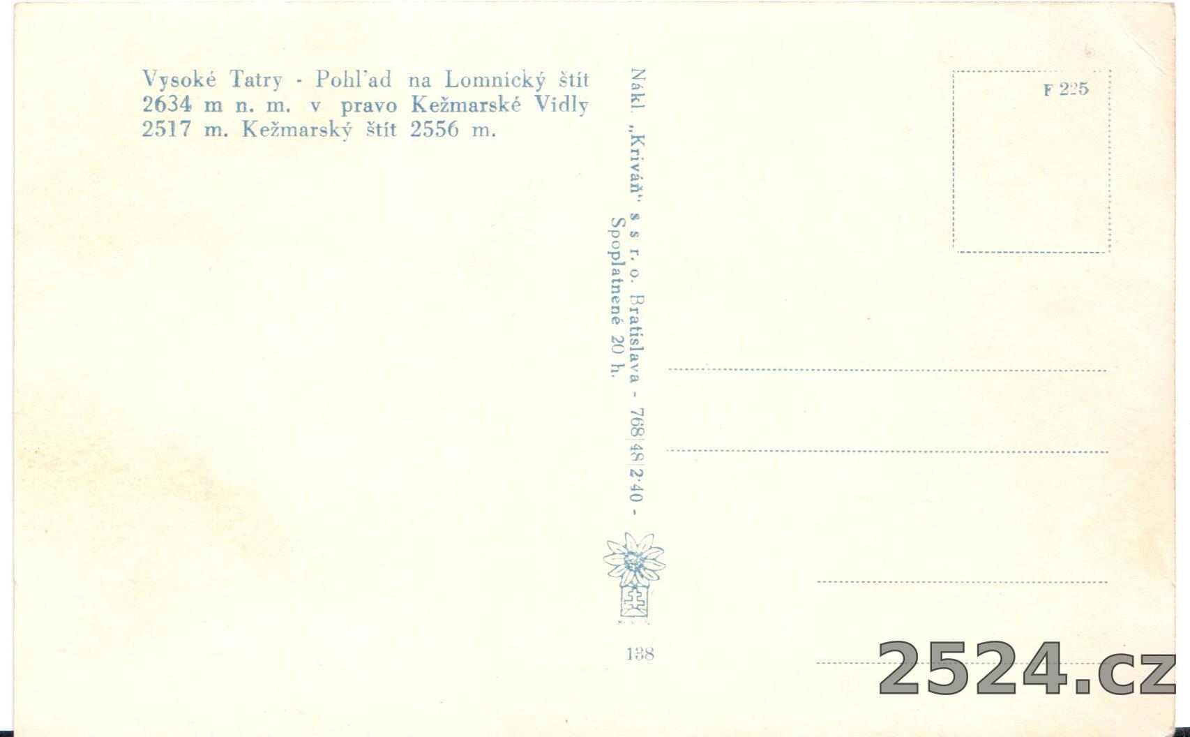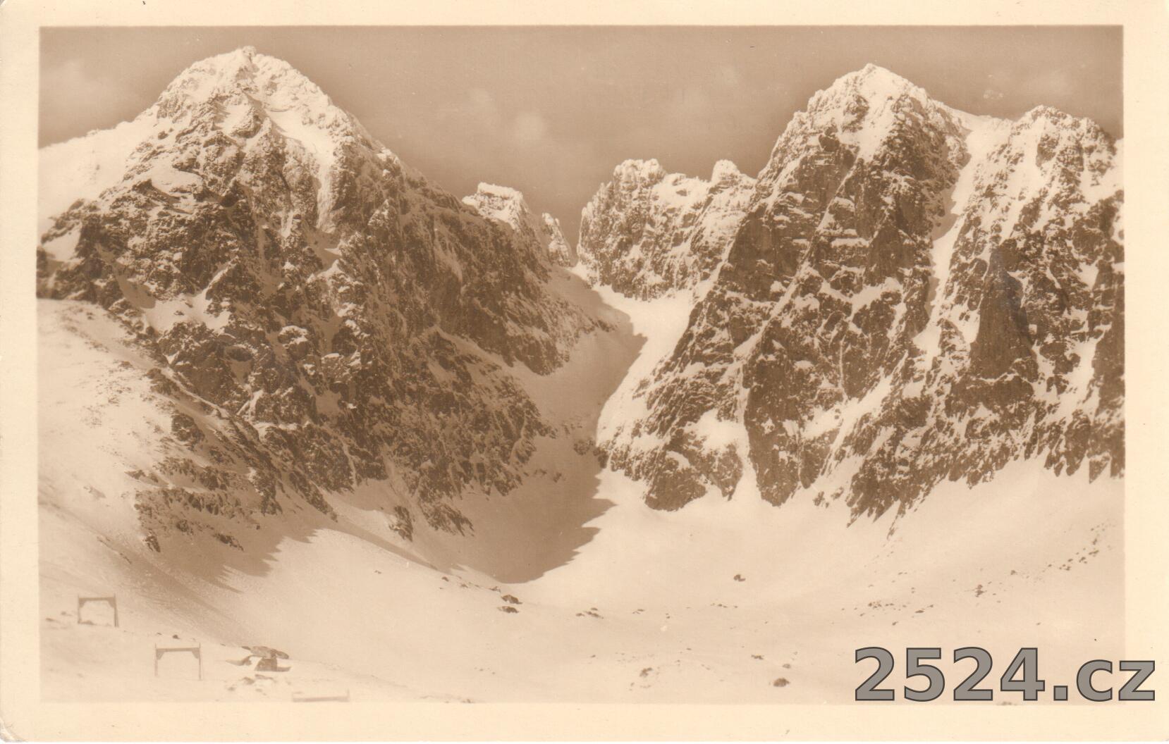 Popis: neprošlá; Pohled na Lomnícký štít 2634 m v pravo Kežmarské Vidly 2517. Kežmarský štít 2556 m.