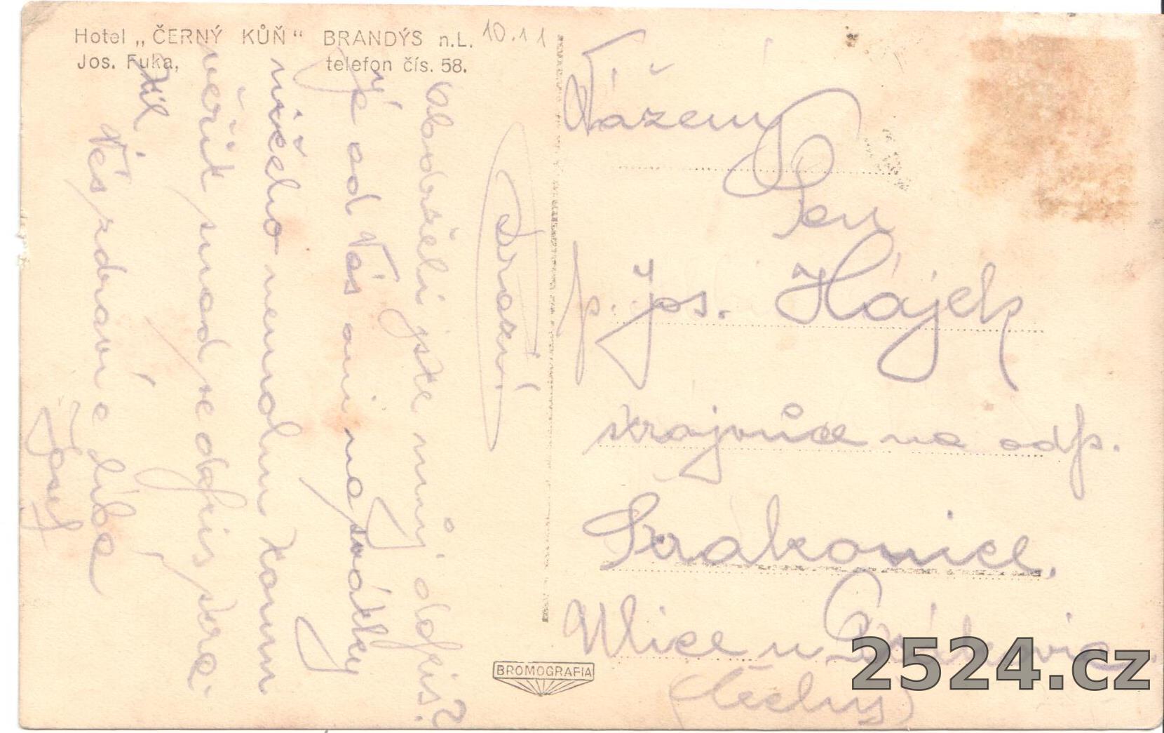 Popis: prošlá; Hotel Černý kůň Brandýs n. L. Jos. Fuka, telefon čís.58