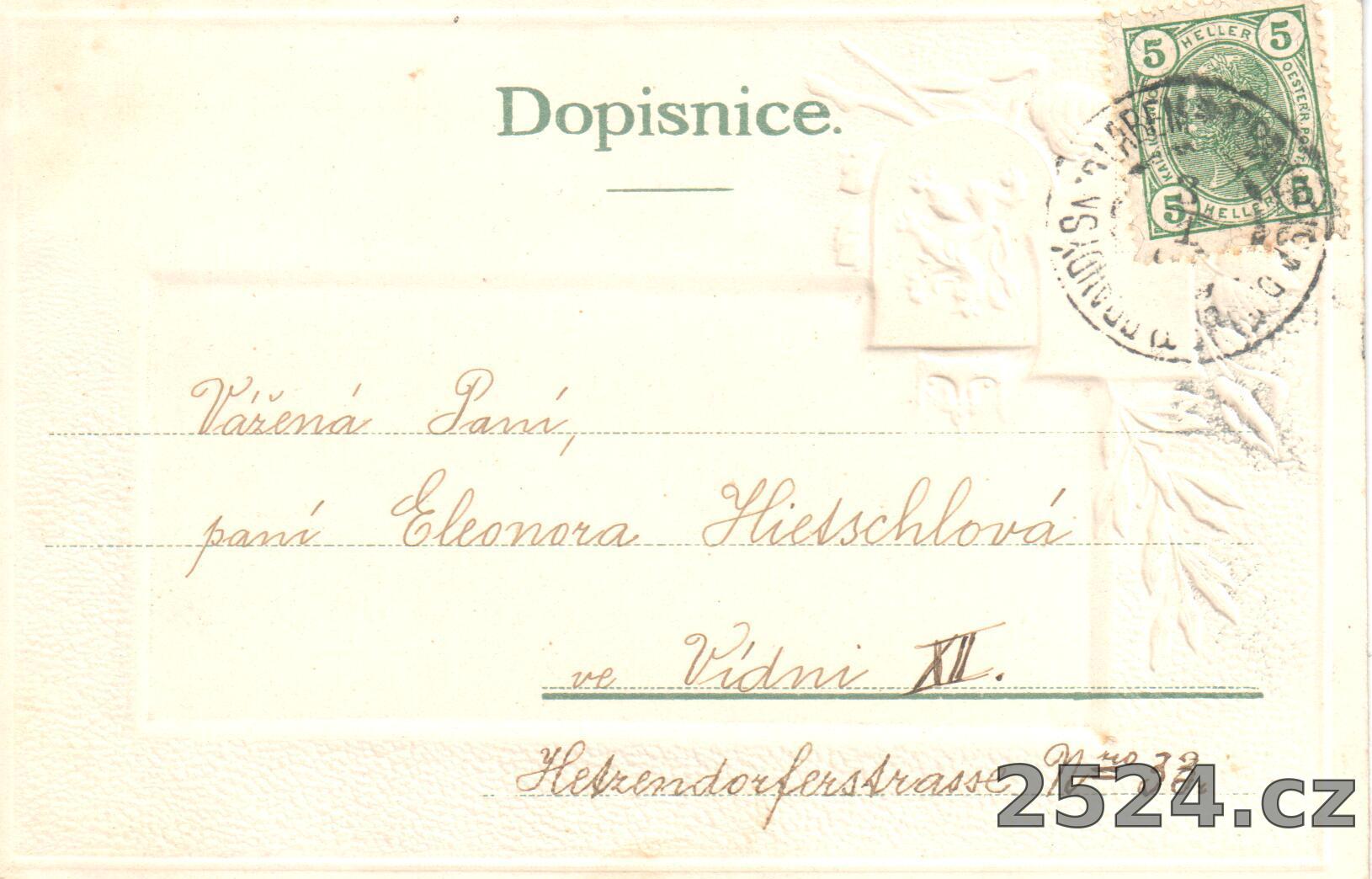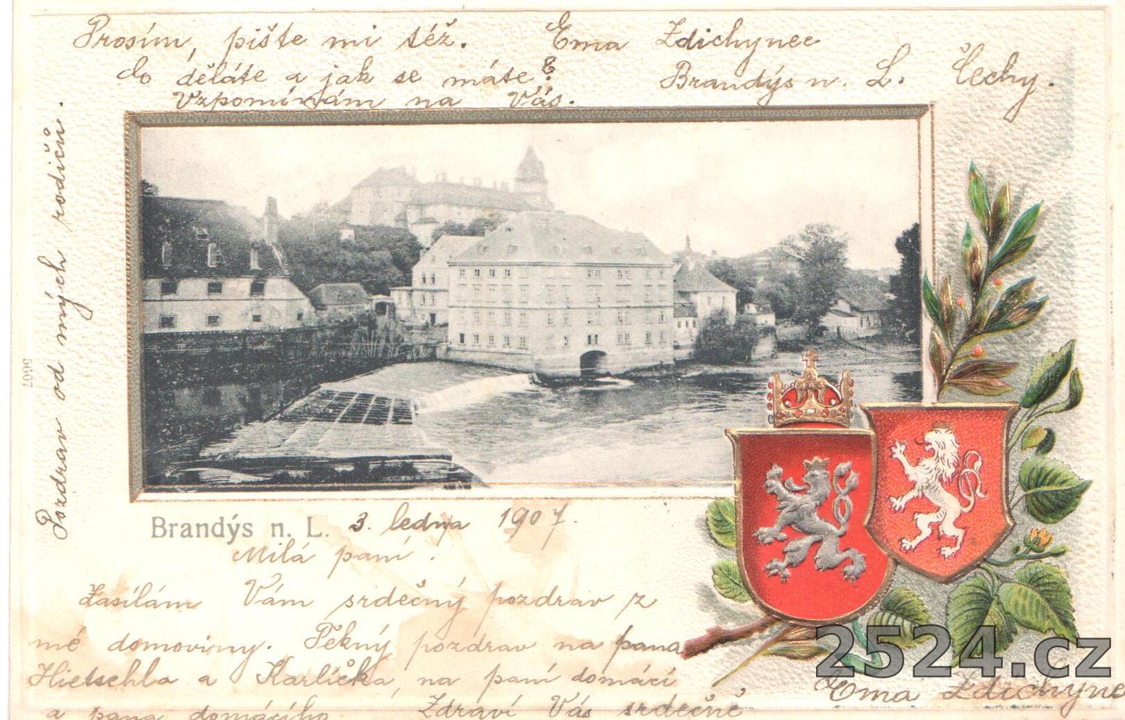 Popis: prošlá 1907; pohlednice tzv. erbovka protlačovaná; pohled na zámek přes Labský jez