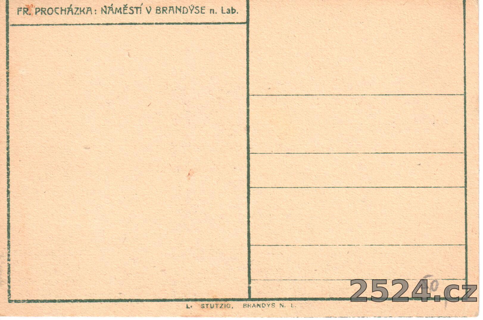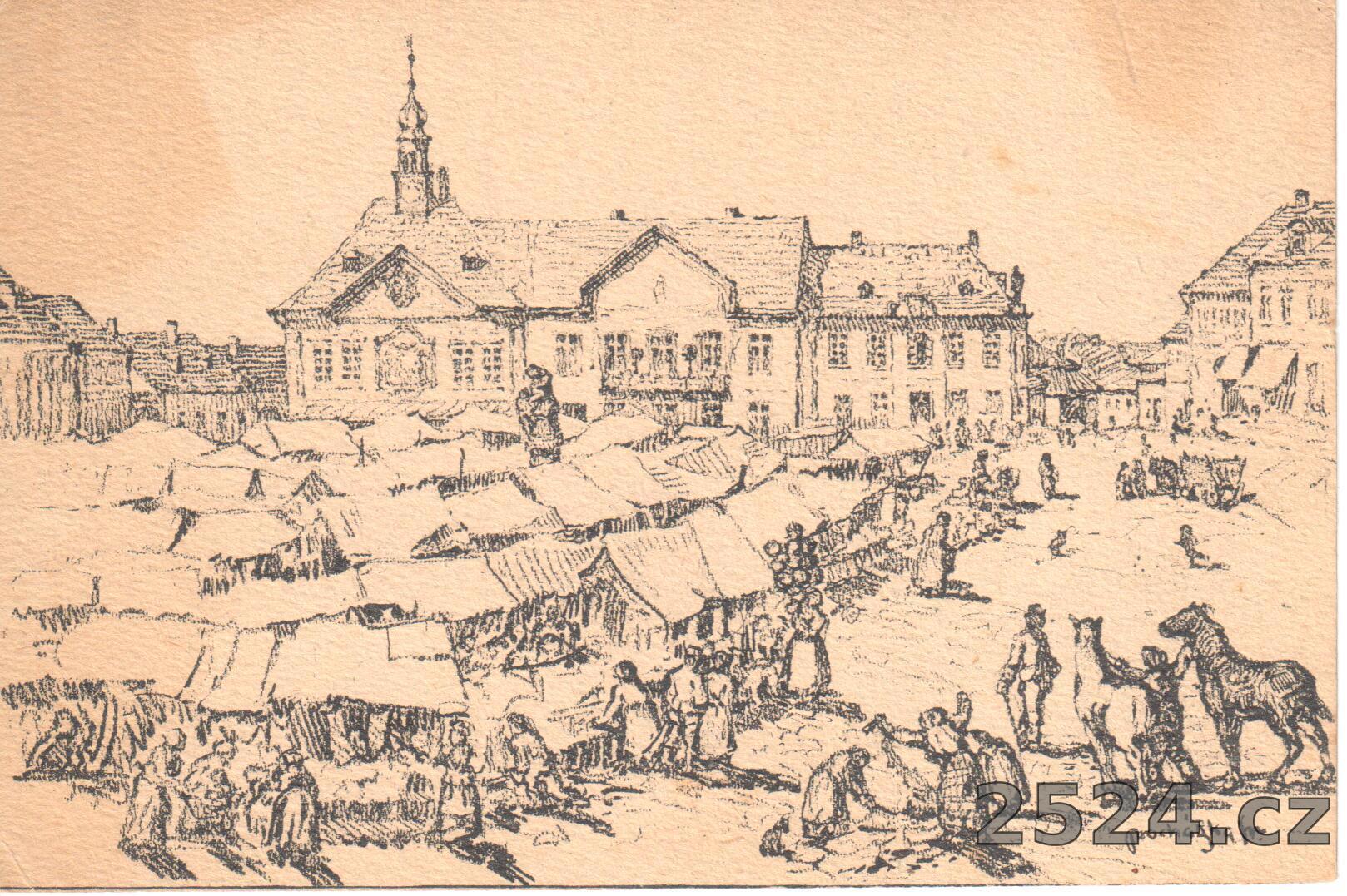 Popis: neprošlá, pohlednice ze sady pohlednic malíře F. X. Procházky, zobrazuje trh na náměstí, pravděpodobně skica k obrazu který je v majetku města Brandýsa n. L.