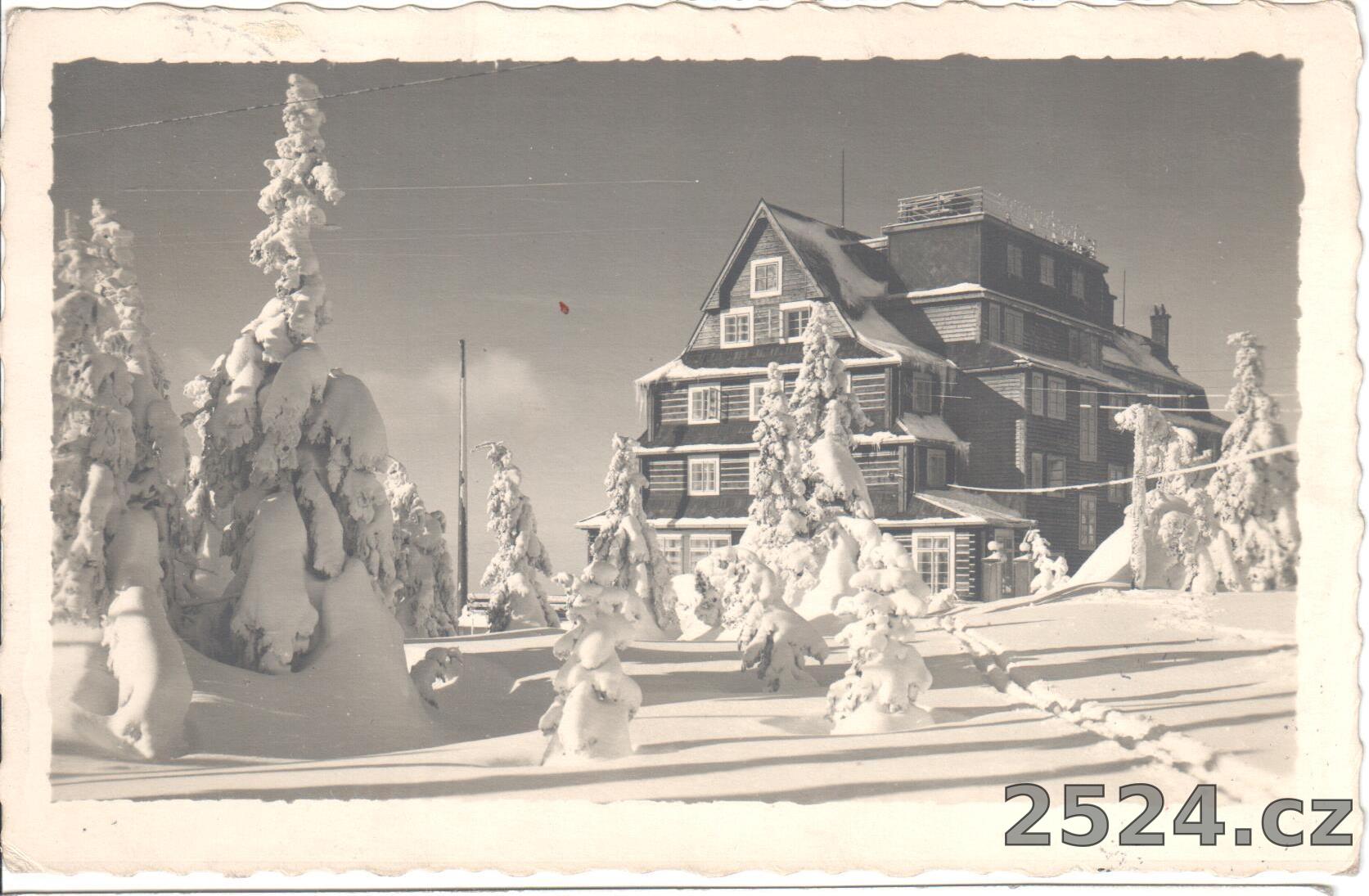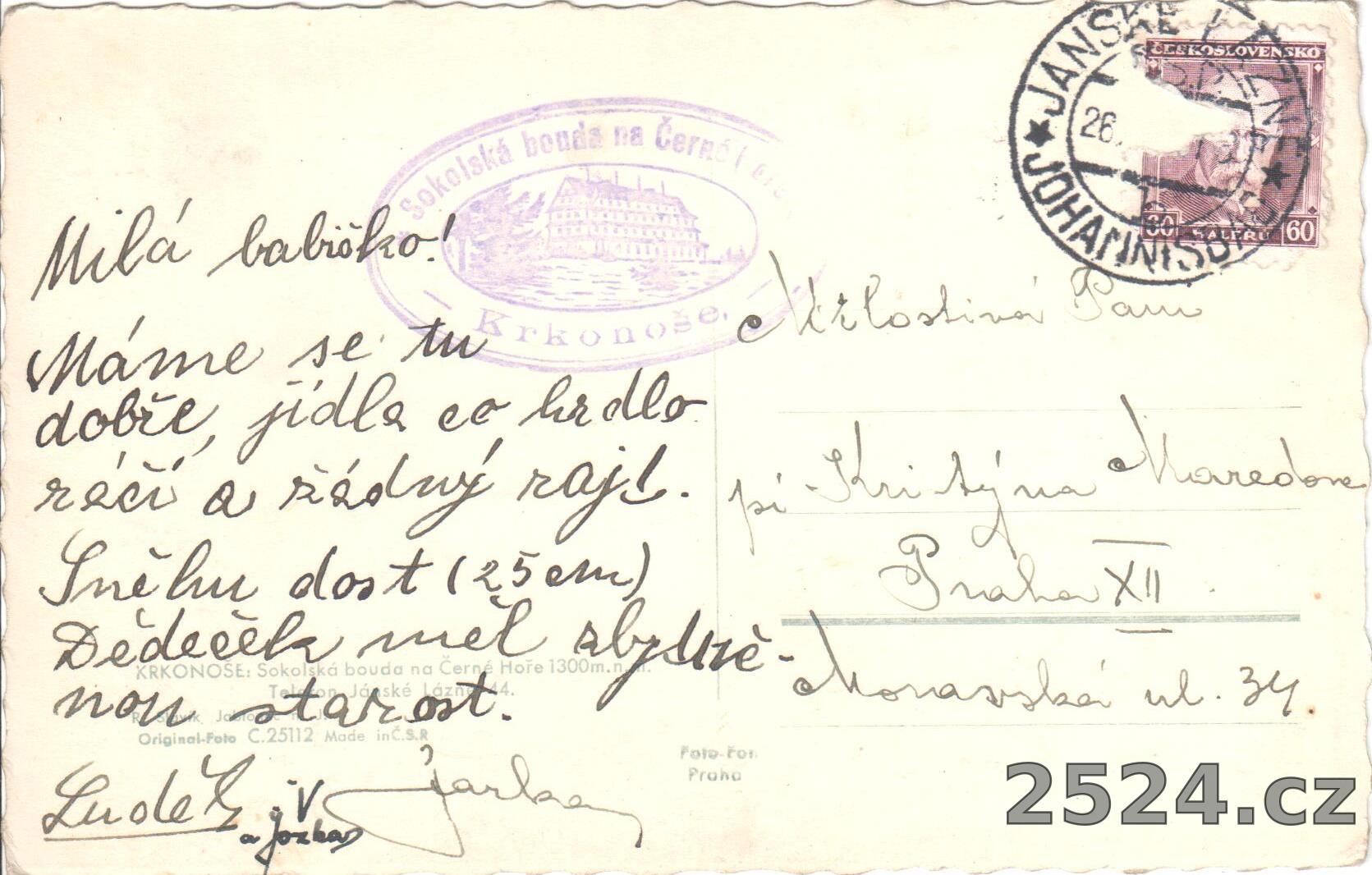 Popis: prošlá; Sokolská bouda na Černé hoře 1300 m n. m. Telefon Jánské Lázně 44