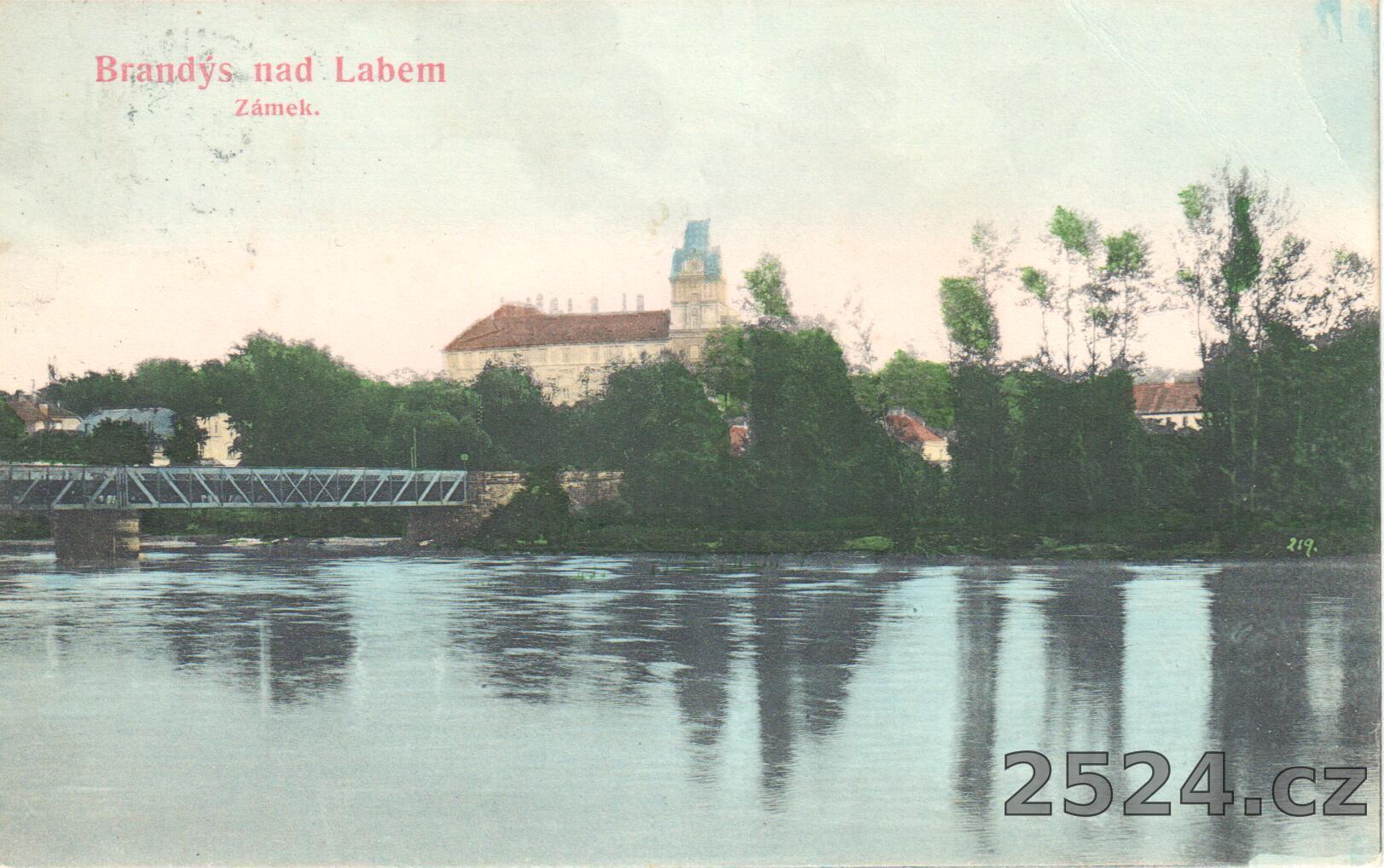 Popis: prošlá 1907; pohled na zámek přes Labe a železný most
