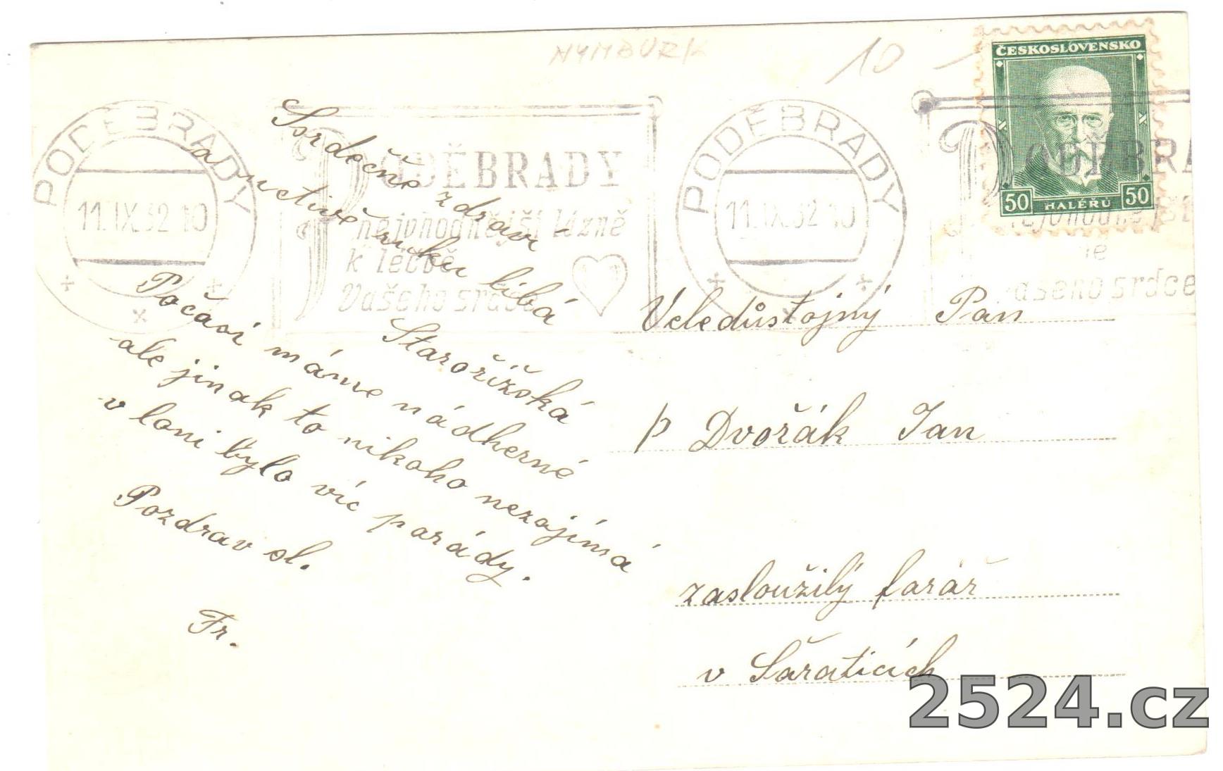 Popis: prošlá 1932, razítko Poděbrady nejvhodnější lázně k léčbě Vašeho srdce