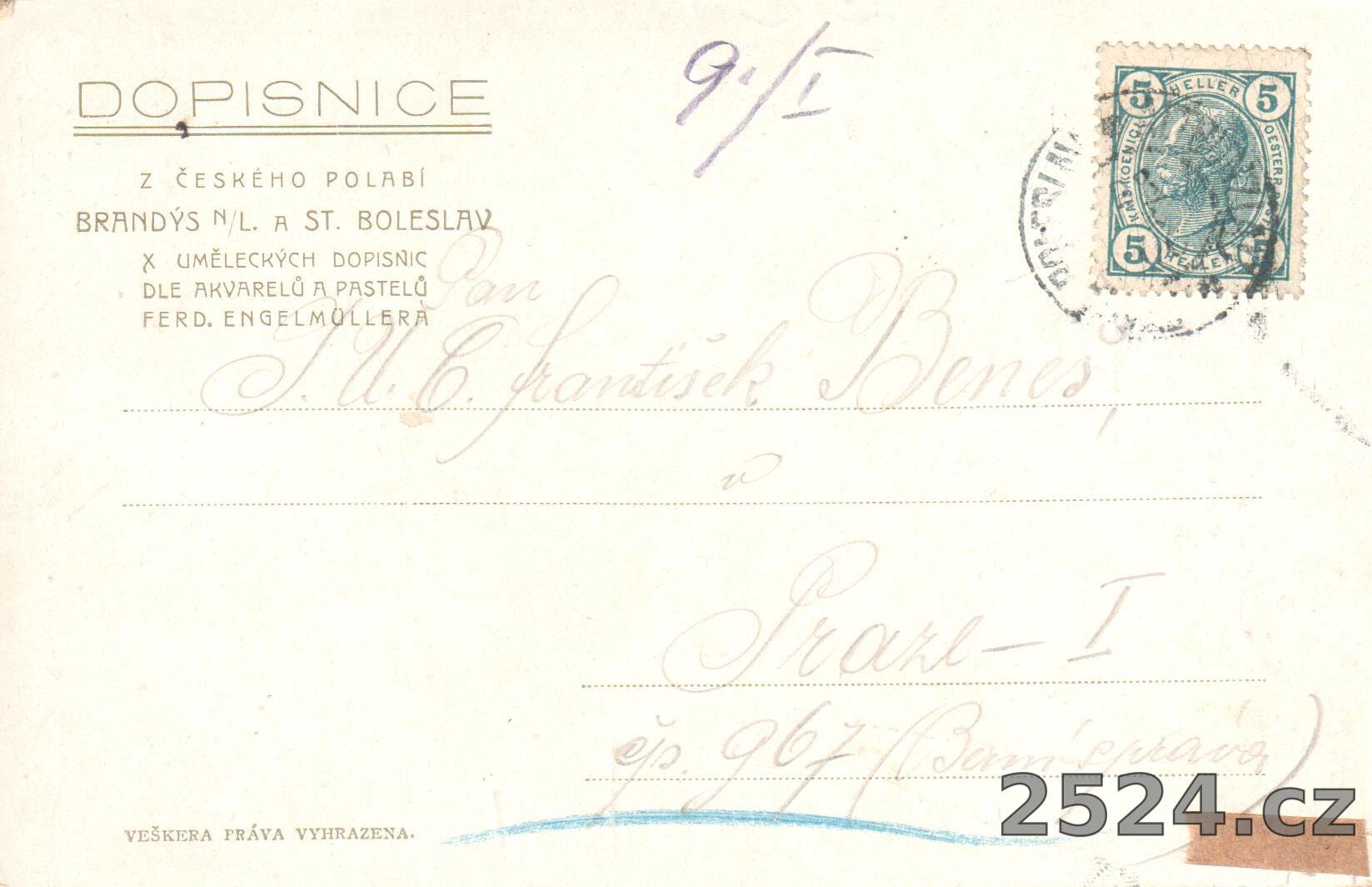 Popis: prošlá; pohlednice z cyklu: Dopisnice českého polabí Brandýs n.L. a St. Boleslav X. uměleckých dopisnic dle akvarelů a pastelů Ferd. Engelmüllera