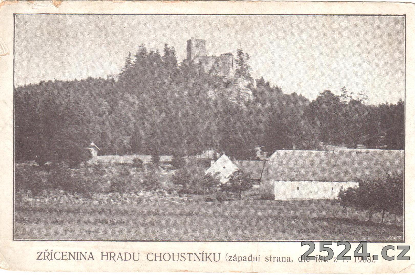 Popis: prošlá; Zřícenina Hradu Choustníku (západní strana dle fot. z r. 1908).