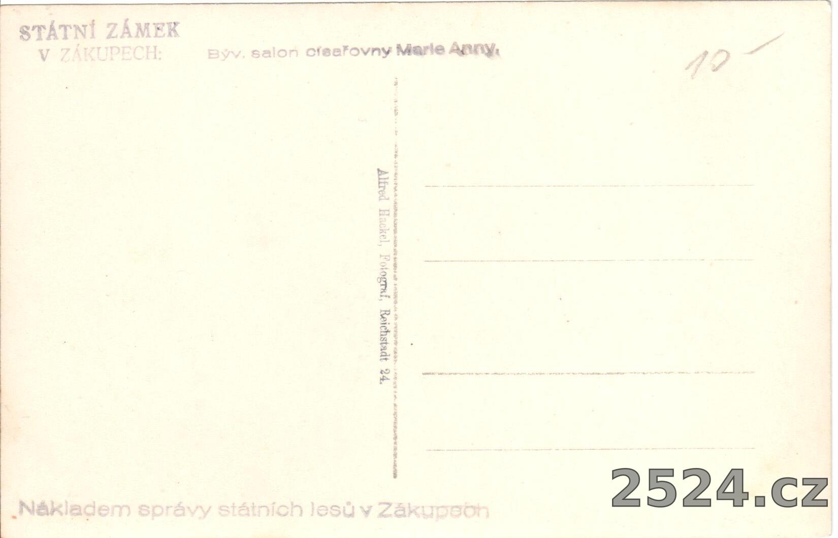 Popis: neprošlá; bývalý salon císařovny Marie Anny; nákladem správy státních lesů v Zákupech.