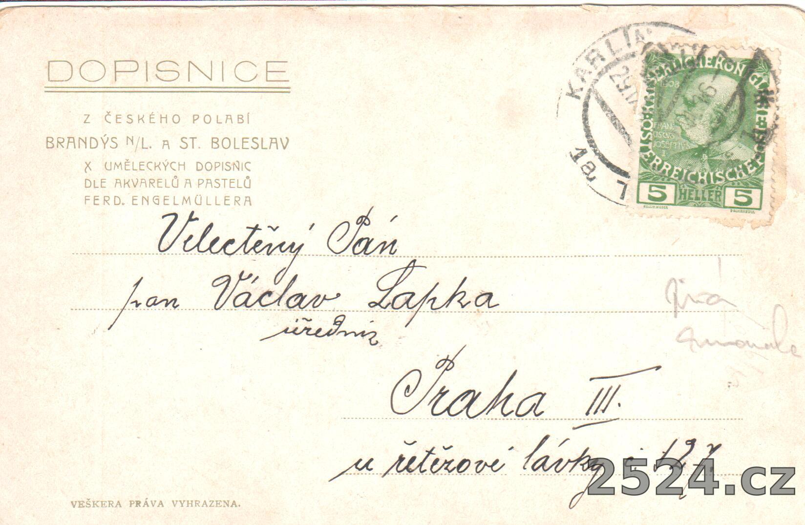 Popis: prošlá; pohlednice z cyklu: Dopisnice českého polabí Brandýs n.L. a St. Boleslav X. uměleckých dopisnic dle akvarelů a pastelů Ferd. Engelmüllera