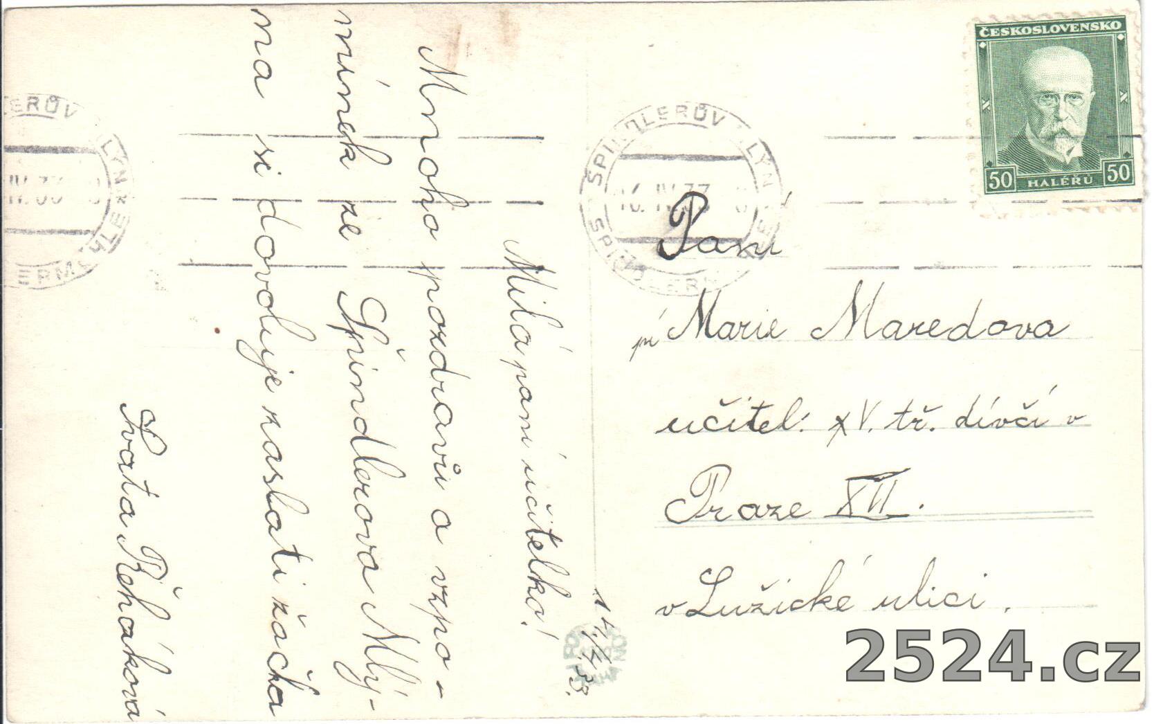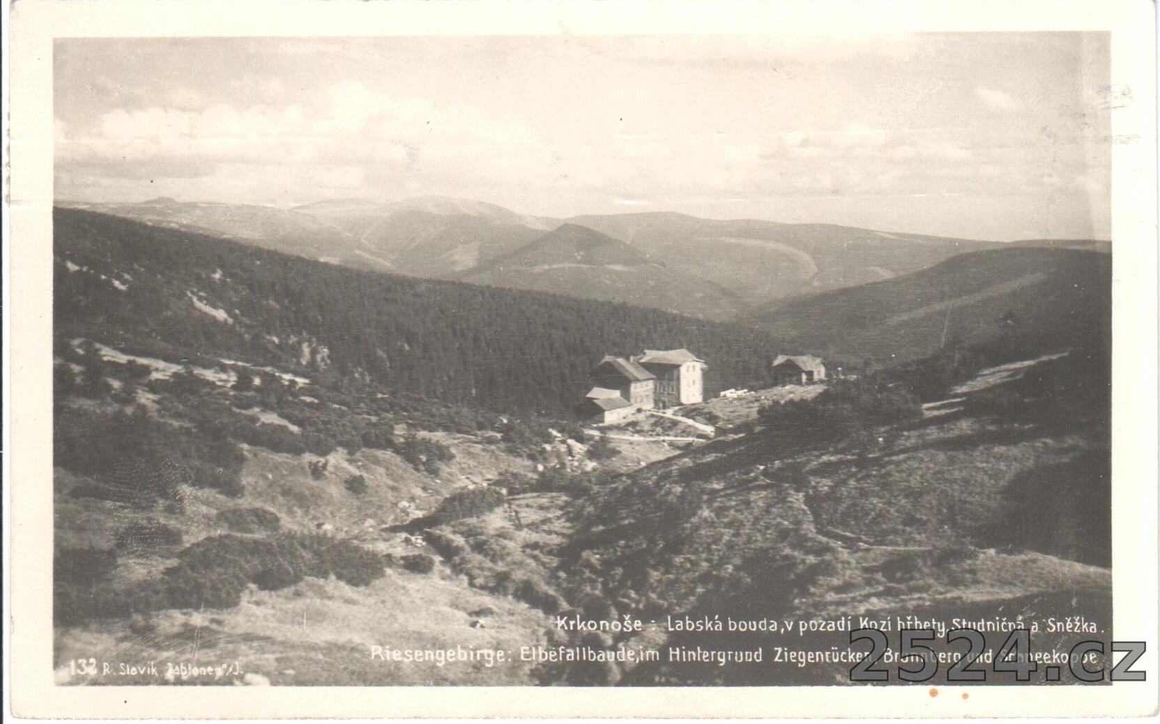 Popis: prošlá 1933; Labská bouda, v pozadí Kozí hřbety, Studničná a Sněžka