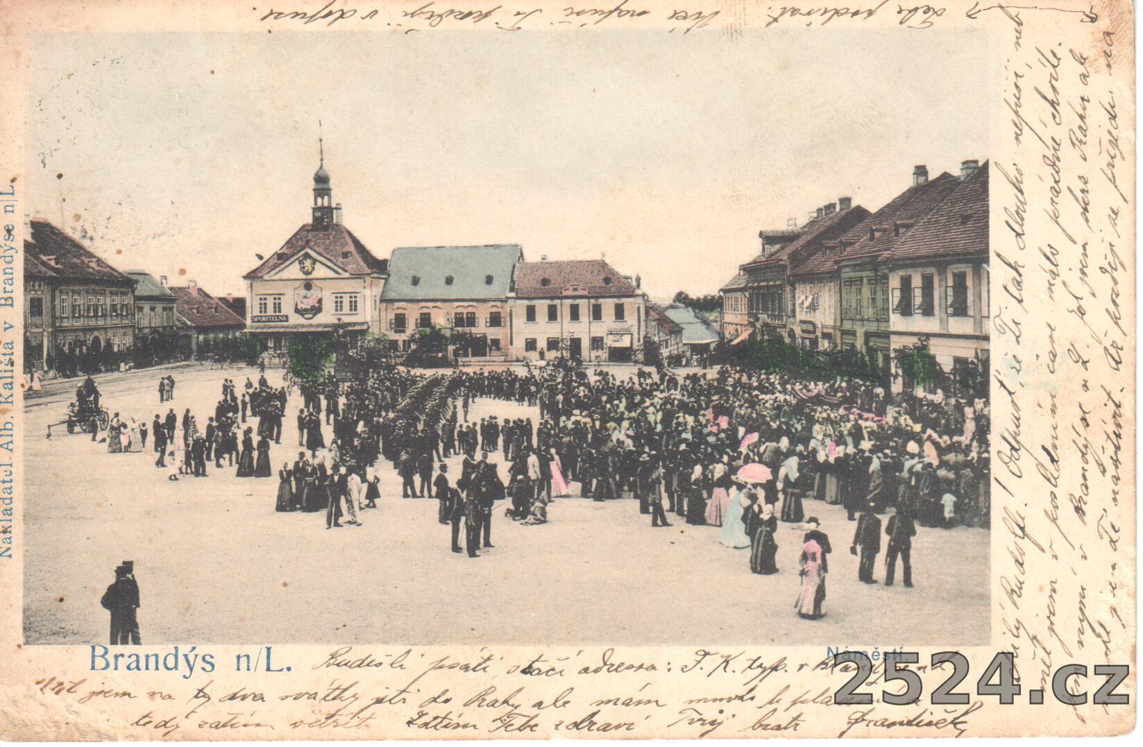 Popis: Shromáždění lidí v Brandýse nad Labem na náměstí s velkou pravděpodobností jde o fotomontáž.