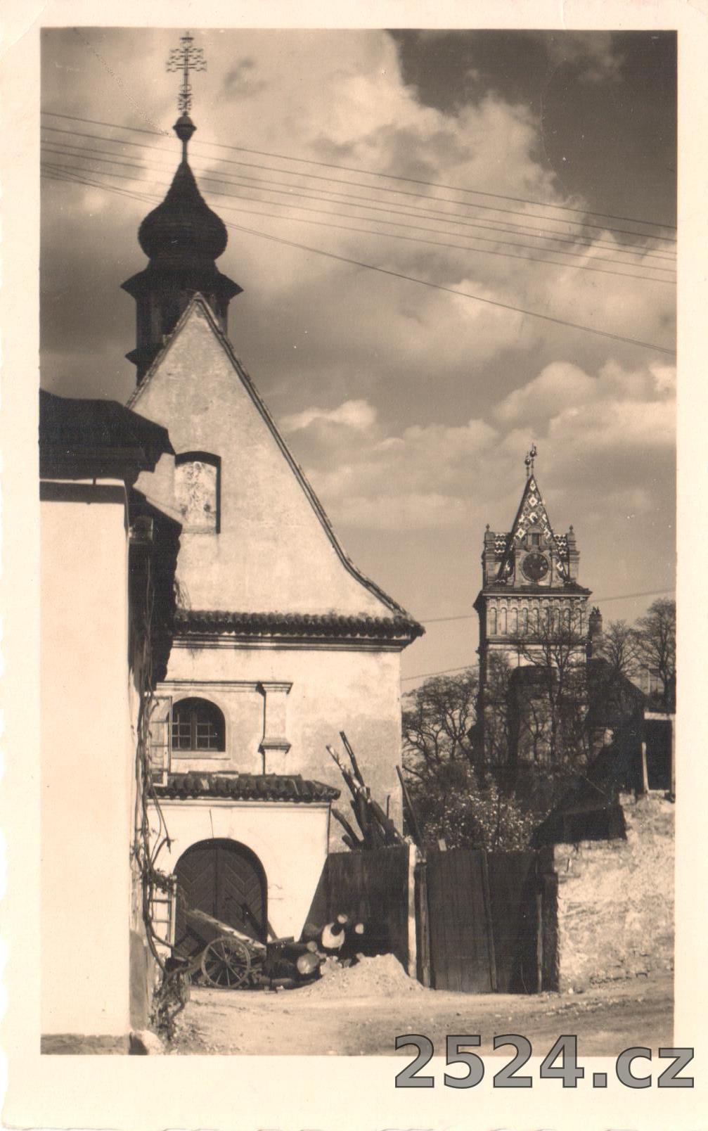 Popis: prošlá 1940; pohled na zámek a kostel sv. Petra