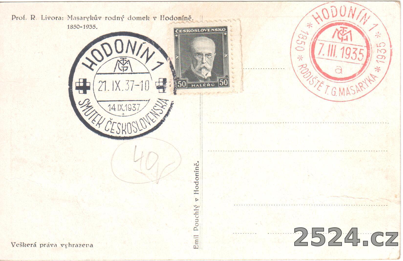 Popis: neprošlá; Prof. R.Livora: Masarykův rodný domek v Hodoníně 1850 - 1935; výroční razítko k umrtí T. G. Masaryka Smutek Československa