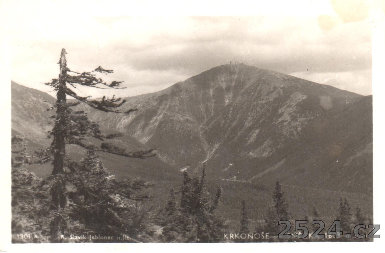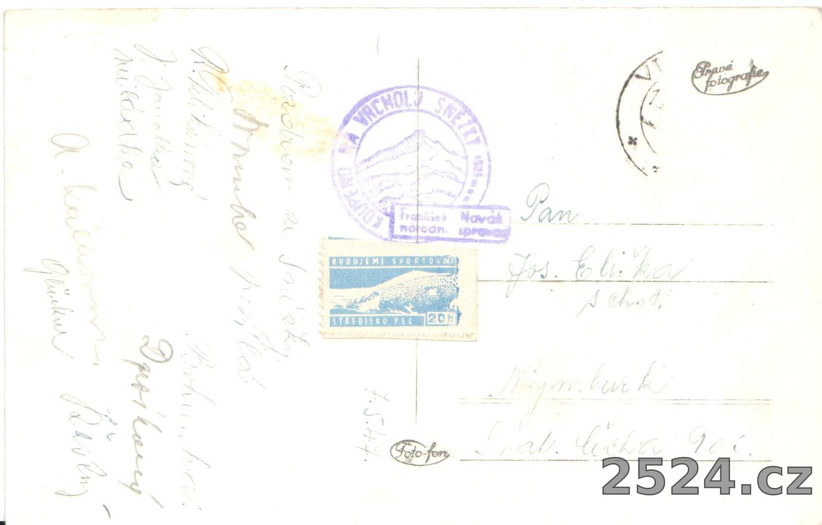 Popis: prošlá 1947; razítko Koupeno na vrcholu Sněžky František Novák národní správce