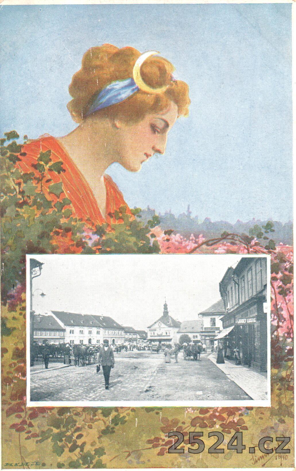 Popis: prošlá; pohled na náměstí; žánrová pohlednice z cyklu čtvero ročních období