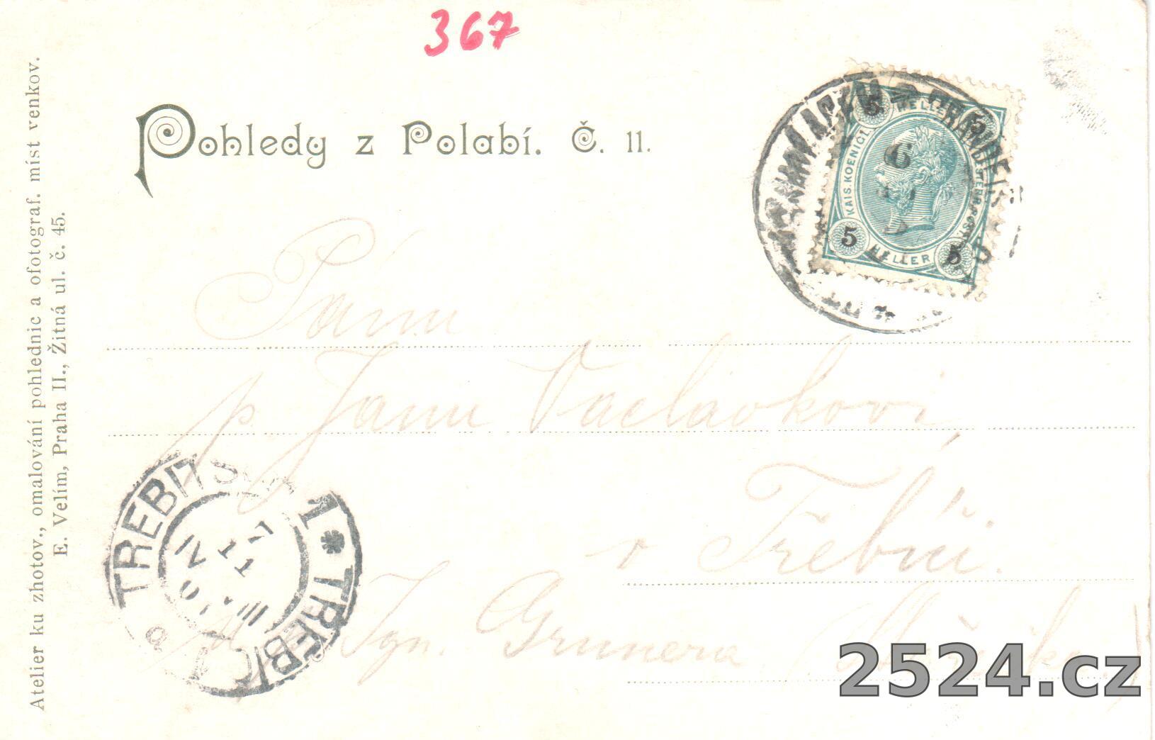 Vydavatel: Atelier ku zhotov. Omalování pohlednic a ofotograf. mist venkov. E. Velim, Praha II, Žitná ulice č. 45