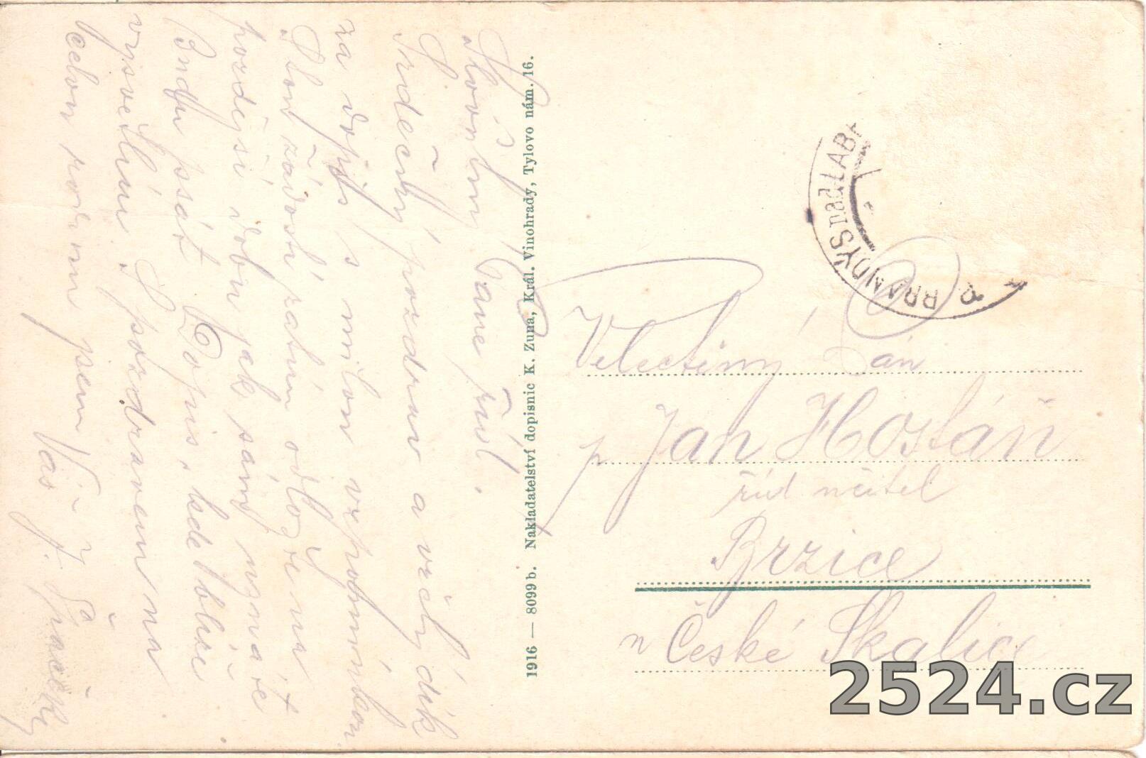 Vydavatel: 1916 - 8099 b. Nakladatelství dopisnic K.Zuna, Král. Vinohrady, Tylovo nám. 16