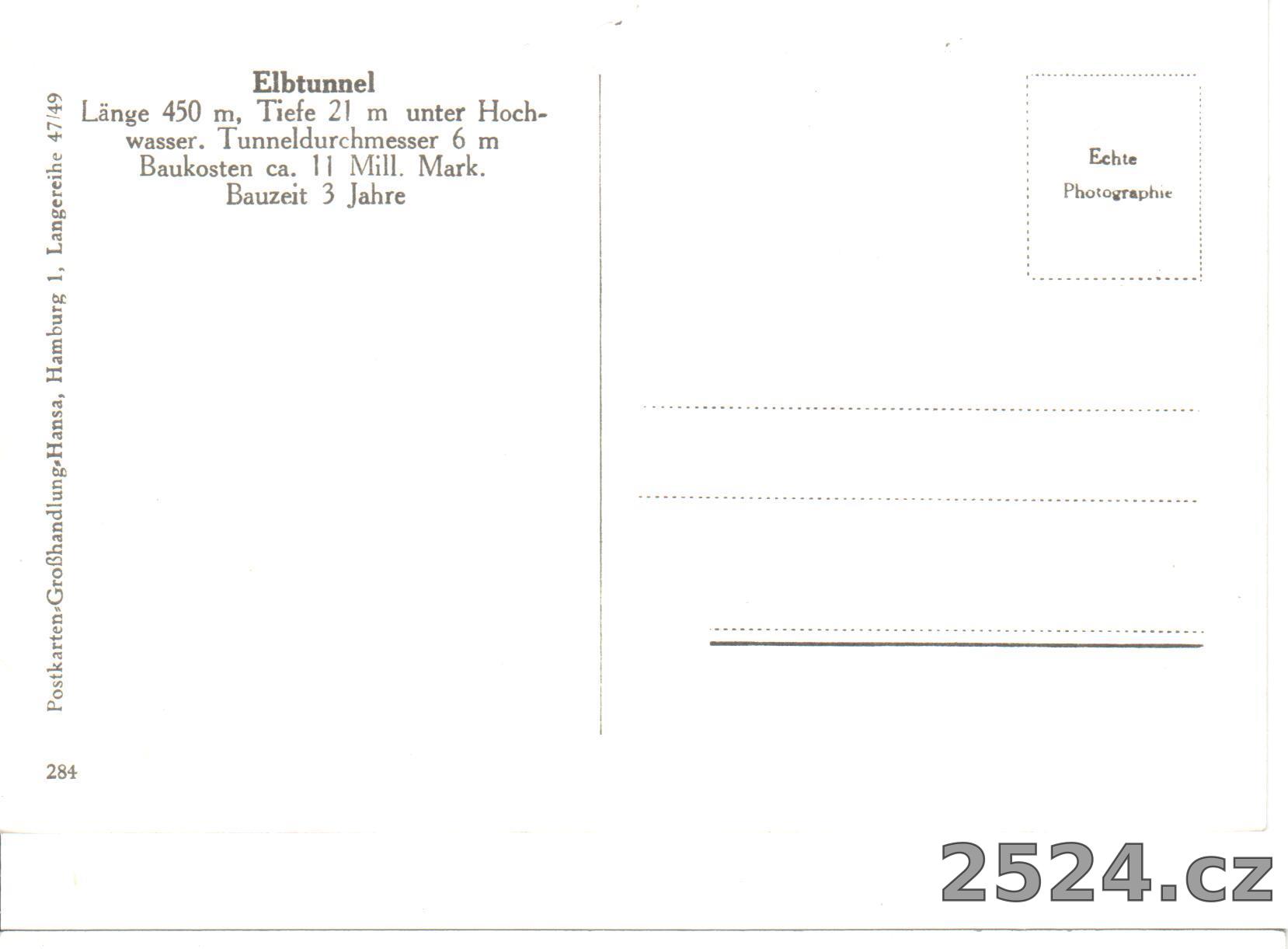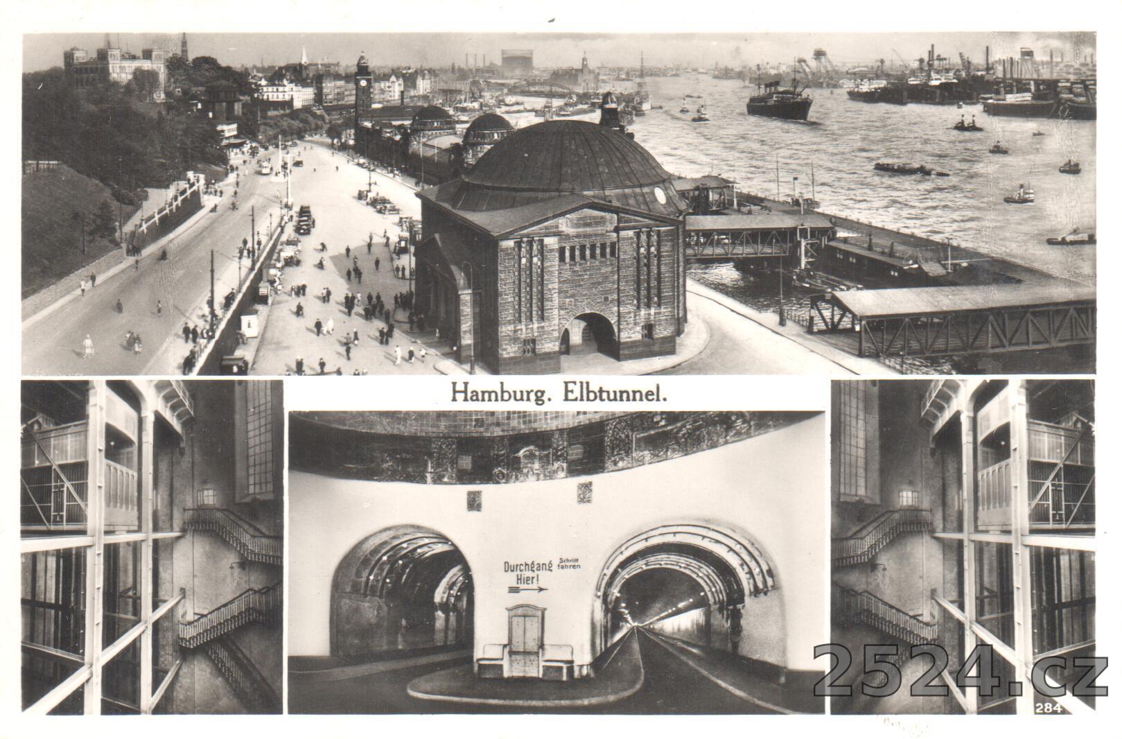 Popis: neprošlá; Elbtunnel, Lange 450 m. Tiefe 21 m under Hochwasser, Tunnel durchmesser 6 m, Baukosten ca. 11 Mill. Mark, Bauzeit 3 Jahre