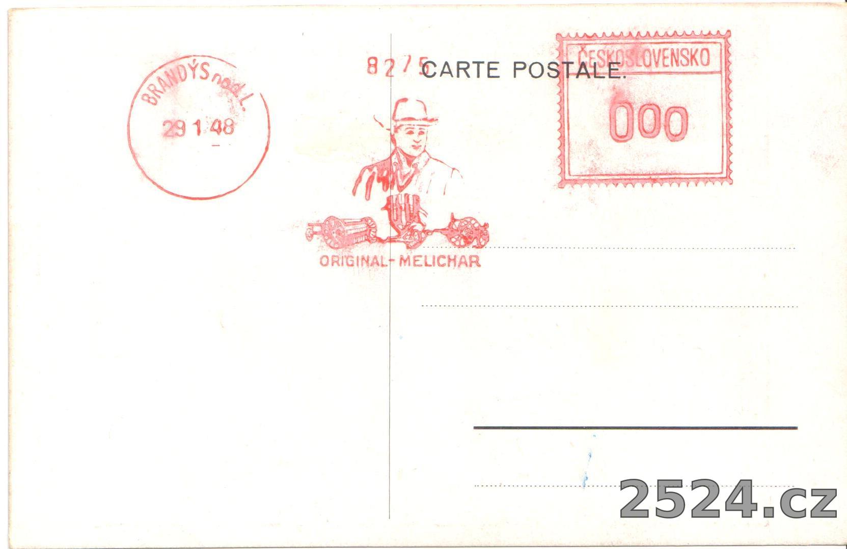Popis: neprošlá; razítko 29.1.1948 Original Melichar, továrna na hospodářské stroje v Brandýse nad Labem