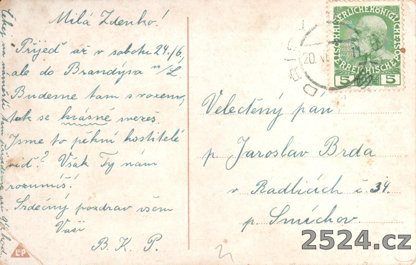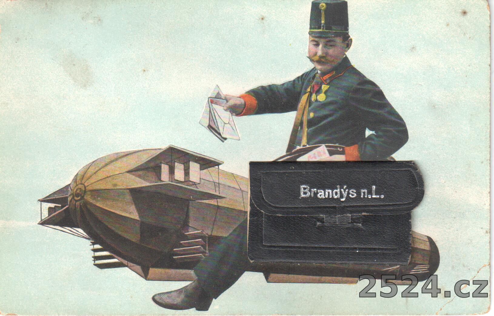 Popis: prošlá 1911, motiv vzducholodě s pošťákem a brašnou, v brašně je skládačka s pohledy na Brandýs n. L.