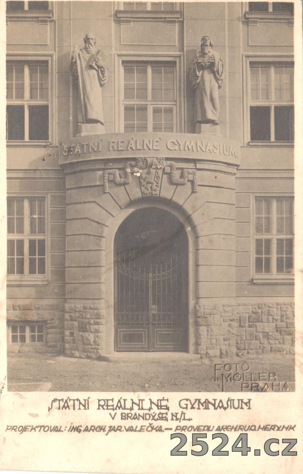 Popis: neprošlá; Státní reálné gymnázium projektoval: Ing. Arch. Jar. Valečka - provedl:Arch. Rud. Herynk; Foto Moller, Praha; na rubu datace 26. 7. 1928