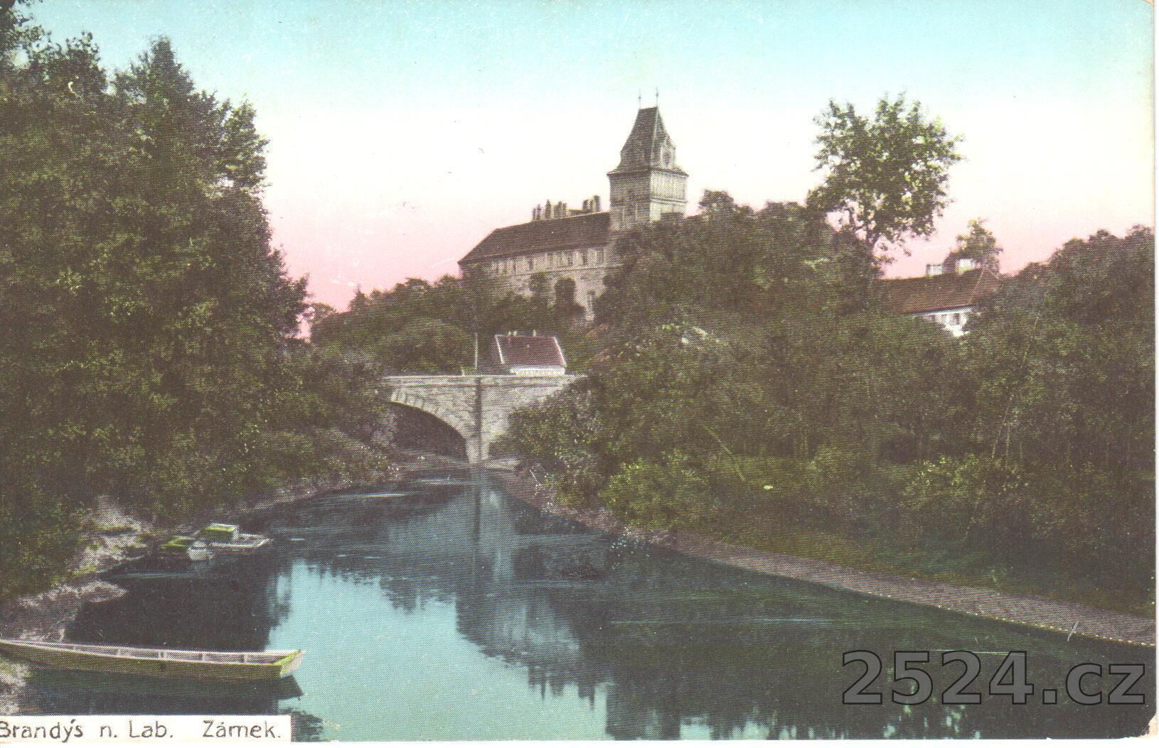 Popis: prošlá 1913; pohled na zámek z mostu na Ostrůvek, pramice, loď