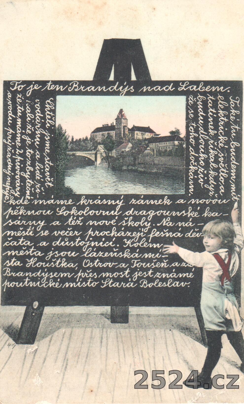 Popis: prošlá 1910, koláž školní tabule, pohled na zámek, text: To je ten Brandýs nad Labem. .....