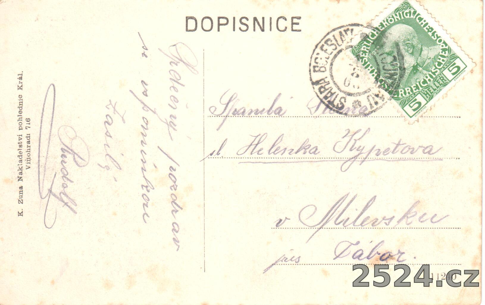 Vydavatel: K. Zuna, Nakladatelství pohlednic Král. Vinohrady 716
