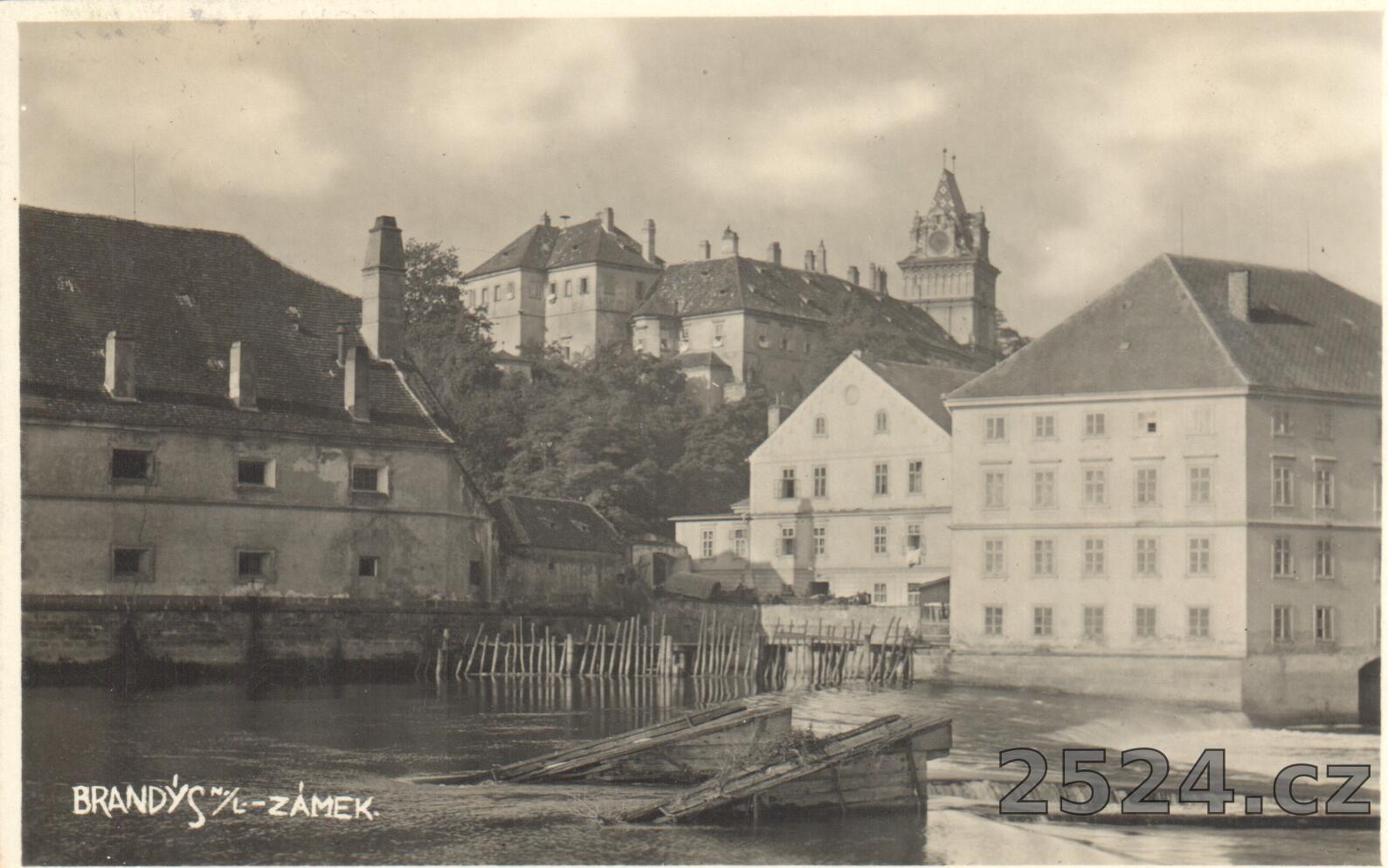 Popis: prošlá; pohled přes Labe na zámek, mlýn a zámecký pivovar