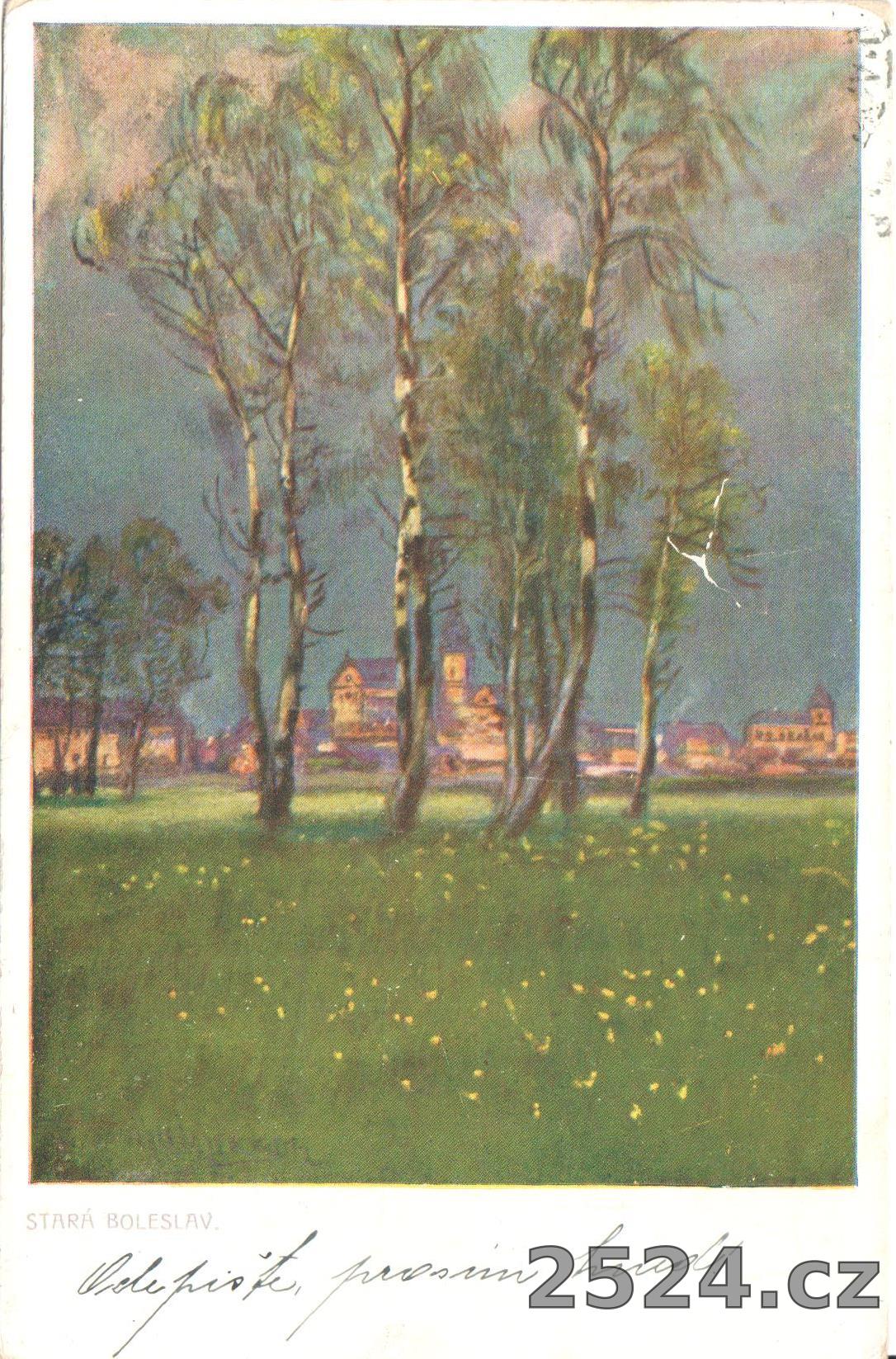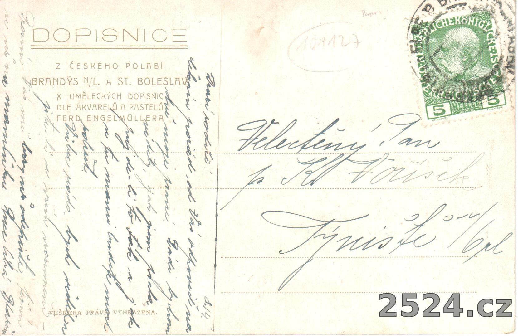 Popis: prošlá; pohlednice z cyklu: Dopisnice českého polabí Brandýs n.L. a St. Boleslav X. uměleckých dopisnic dle akvarelů a pastelů Ferd. Engelmüllera
